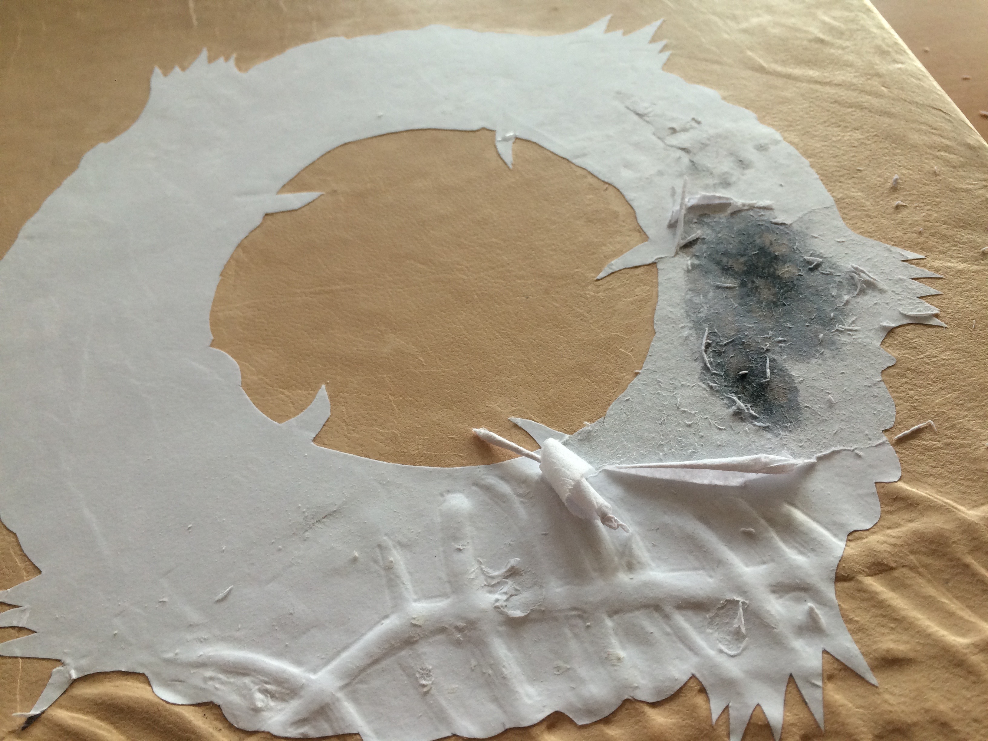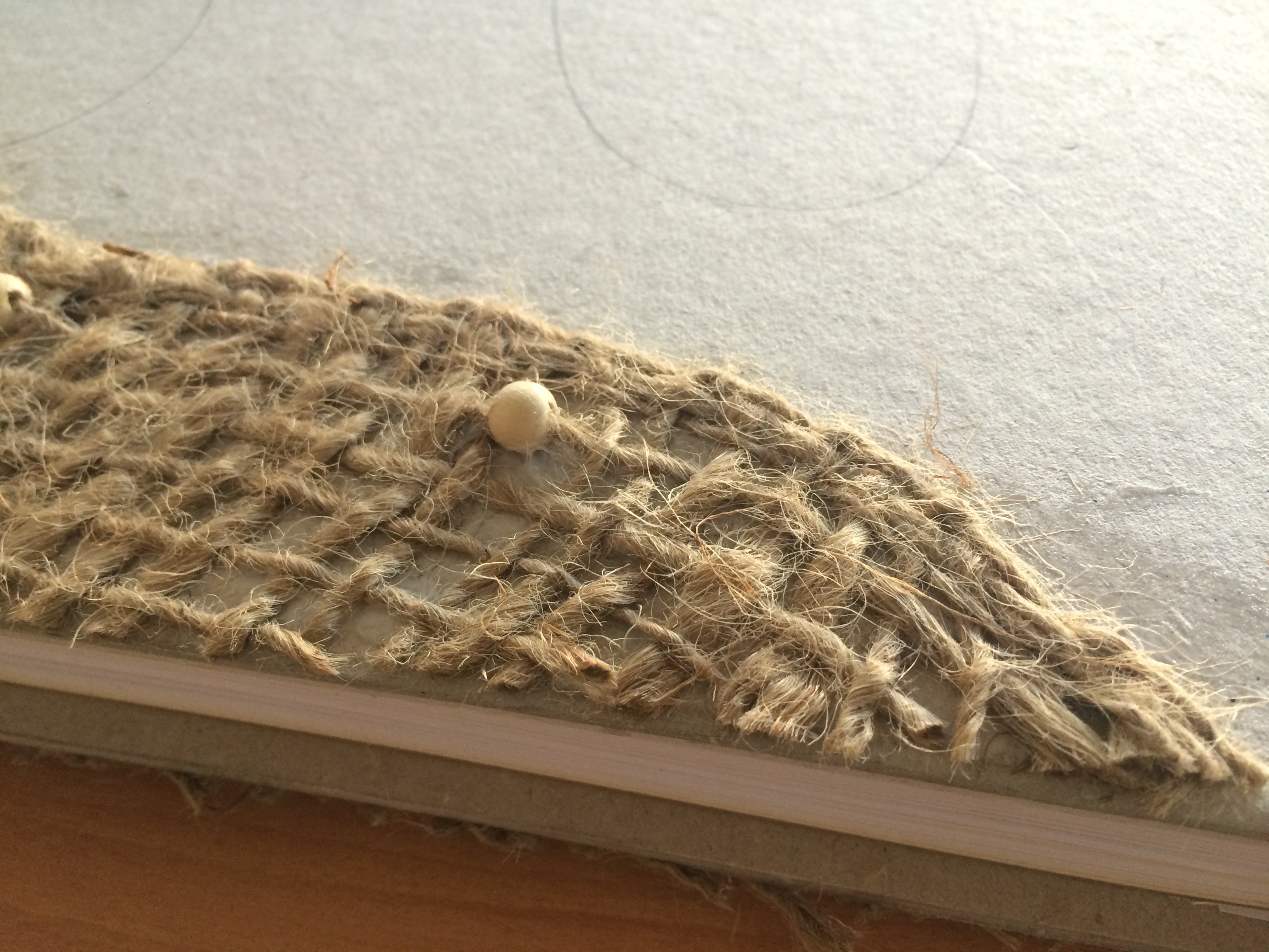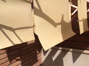 Empecé buscando los materiales idóneos para tan importante tarea… cuerdas de pescador, (la escena se situa entre pescados, mares y destinos , tes diferentes, Bienvenida, la protagonista sirve tés a los marineros, un papel con textura y de color claro, igual que la vida que está llena de texturas, una piel natural, porque la obra transmite la esencia de la vida.