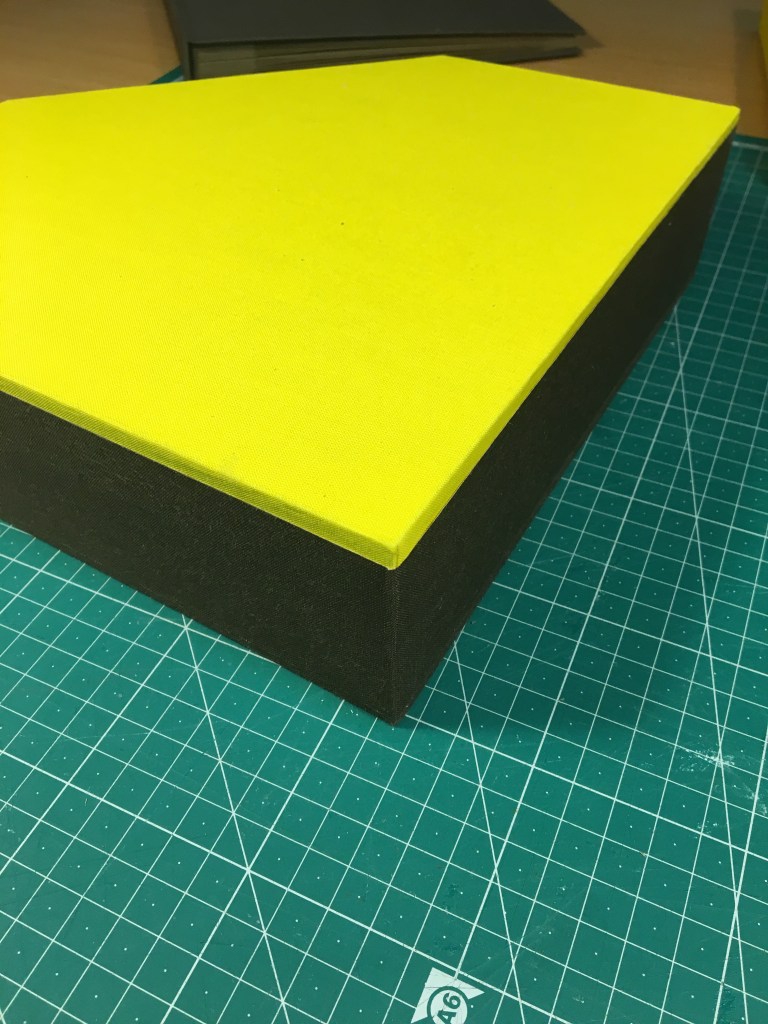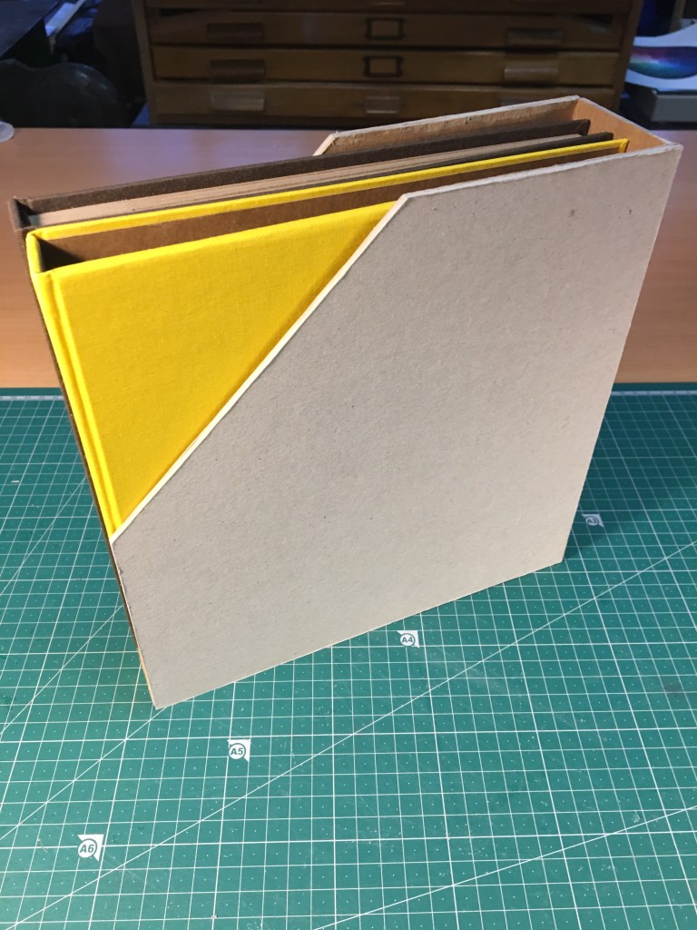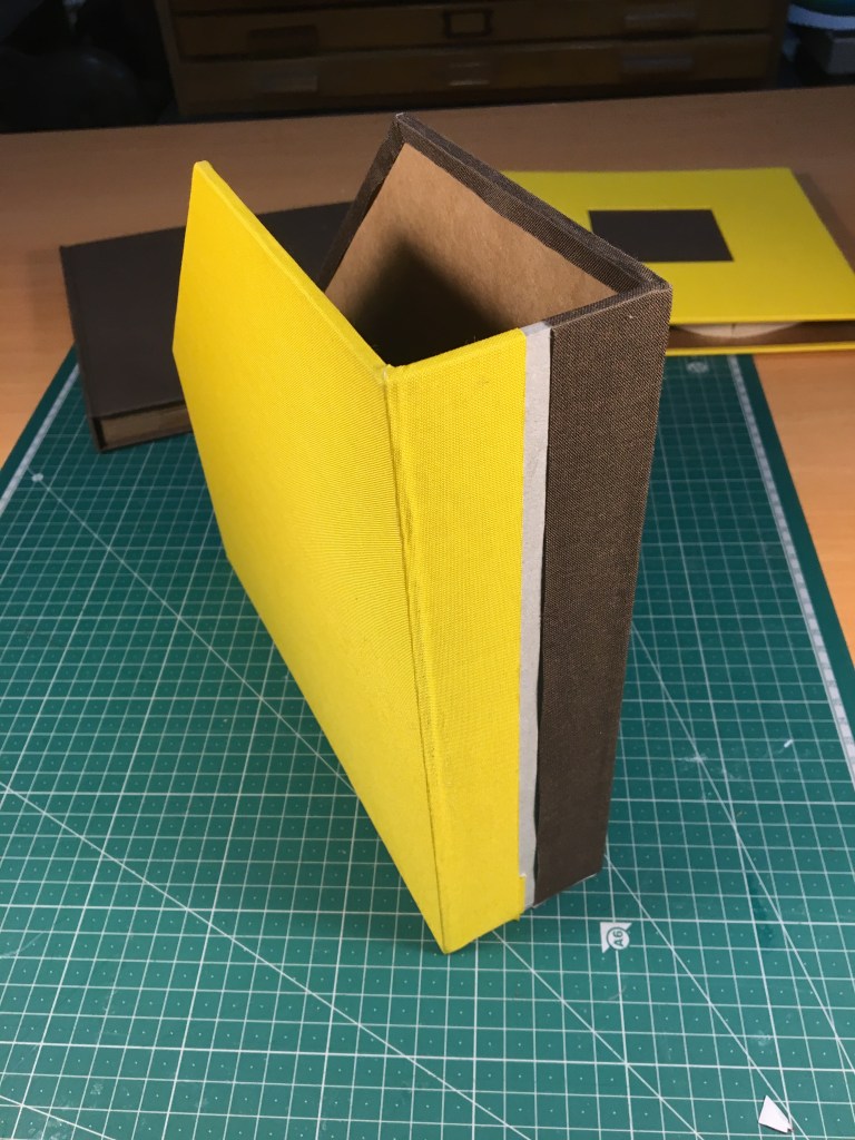 La mida de l’enquadernació i la carpeta és de 20×20 cm. Els Materials del contenidor son de cartó de 3mm (és el gruix idoni) i tela Buckram de color groc combinat amb marró.