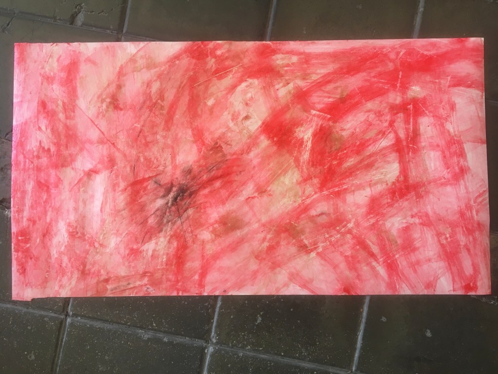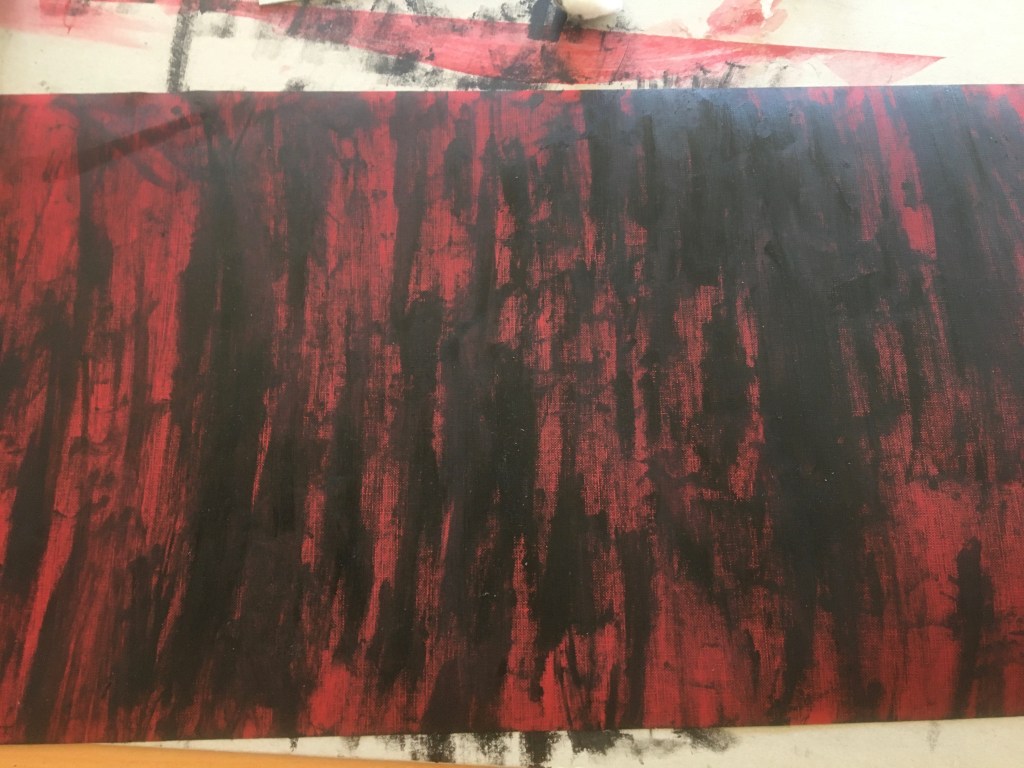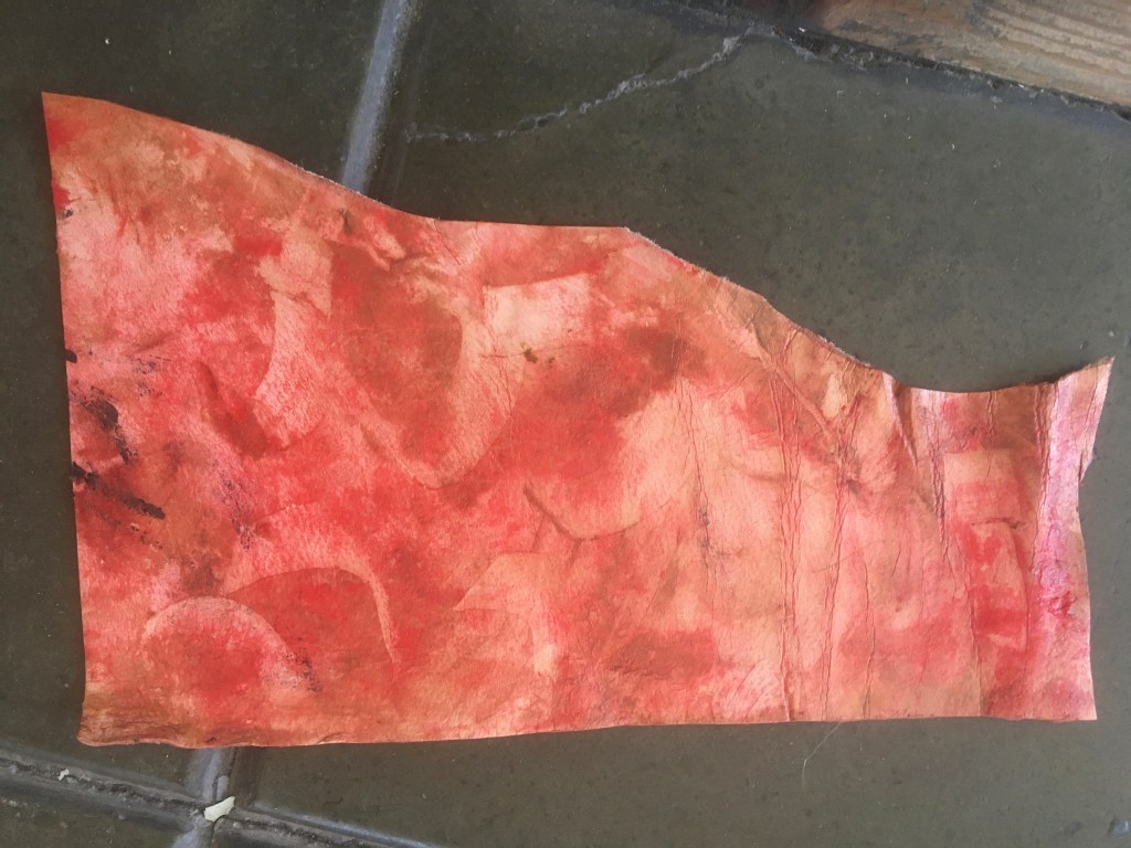 Que divertit és aquest pas!! ho has de provar! primer he fet proves amb la pell, he utilitzat tinta negra per serigrafia i amb un cotó fluix he anat acariciant la pell i paper de tons vermells i s’ha anat convertint en negra.