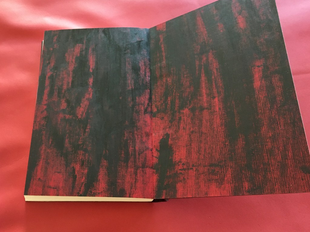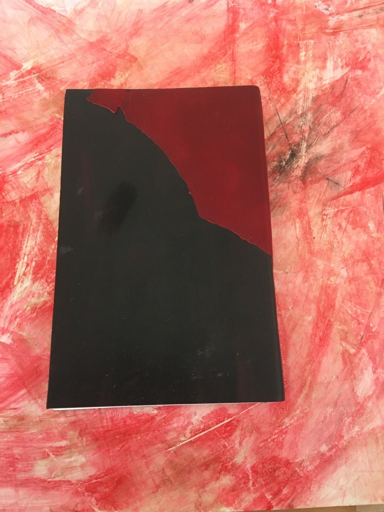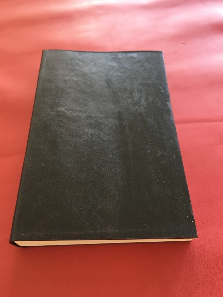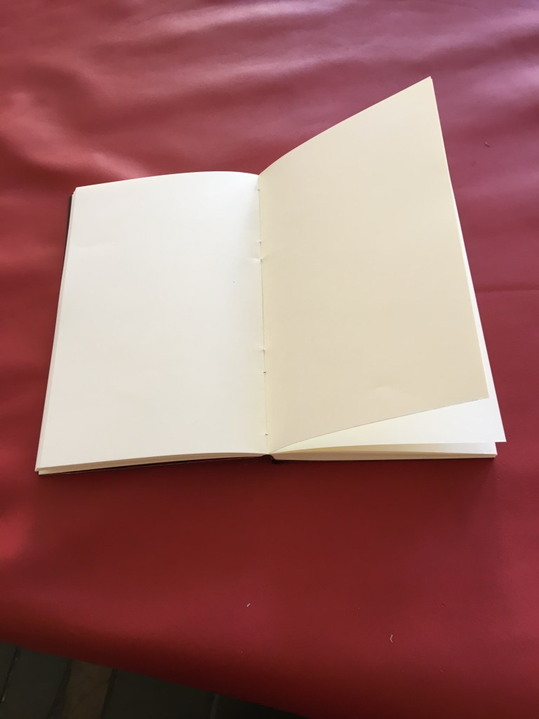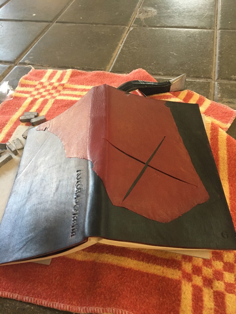 Preparació de la tripa, serrar, cosir amb cintes i telar, encolar llom i posar guardes (primers fulls decorats). La guarda l’he tintat amb taques negres perquè que és la vida, quin sentit té sense taques negres…?
