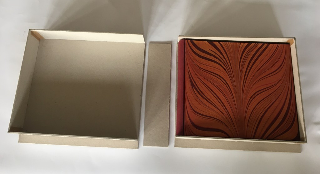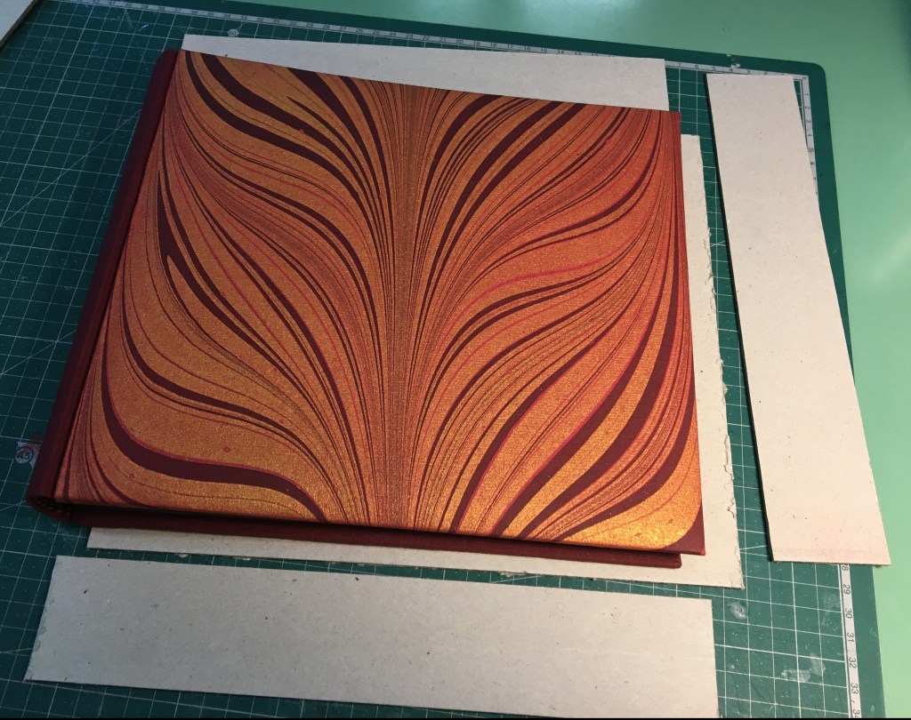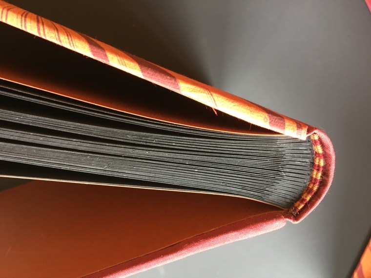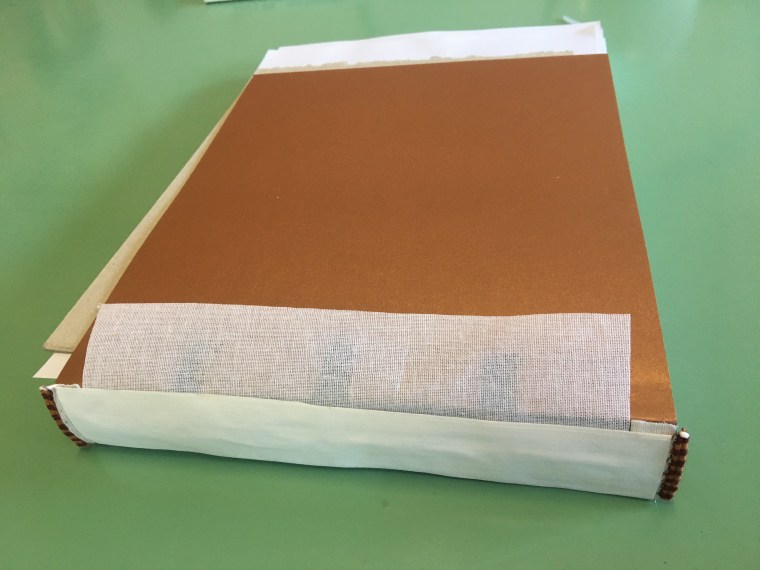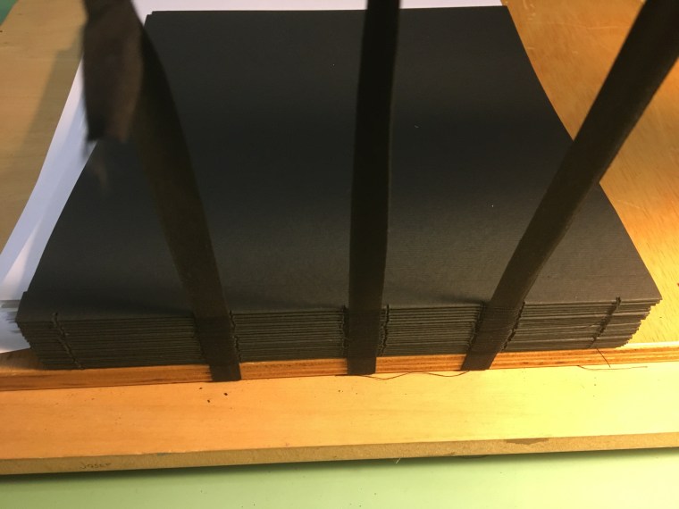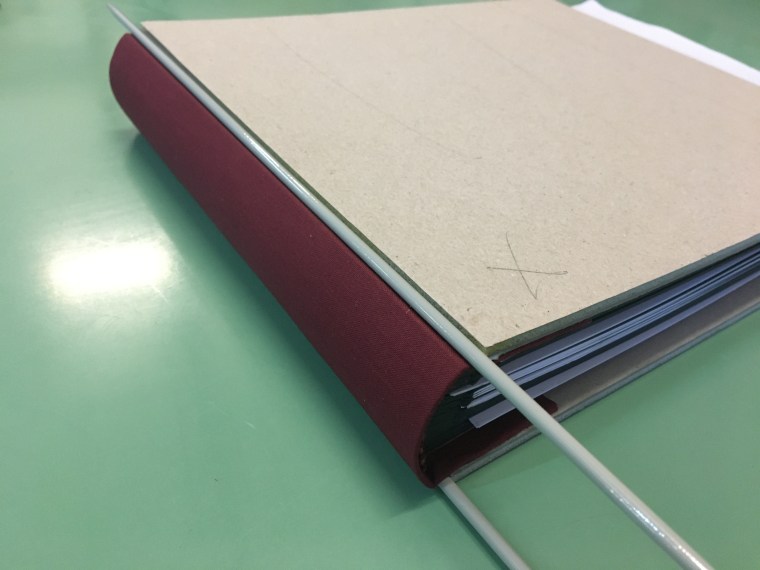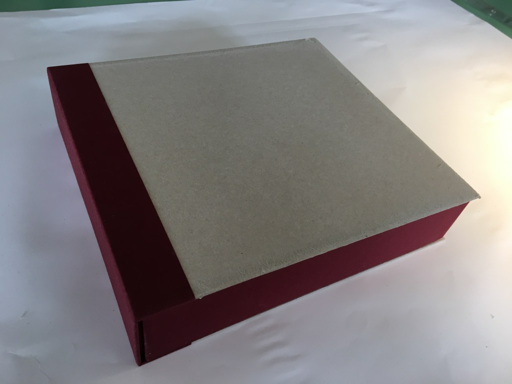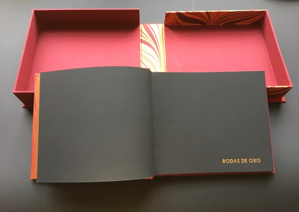 Realització enquadernació per fer un àlbum de fotos per la celebració de les «Bodas de oro». Tapa solta cosida amb telar i cintes, llom rodó. A continuaió un estoig per reservar i preservar l’ àlbum.