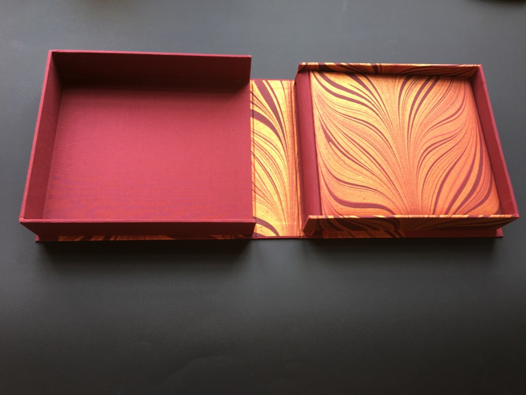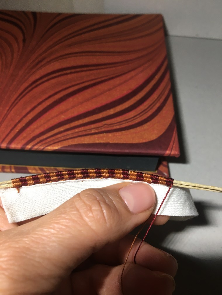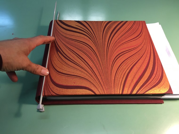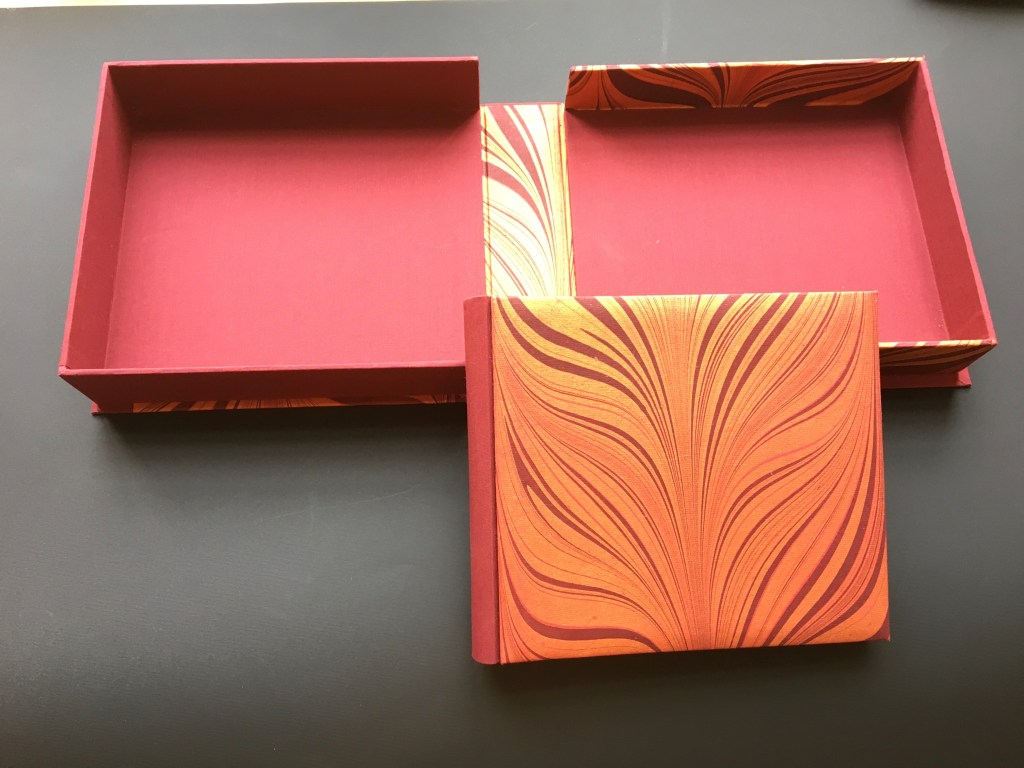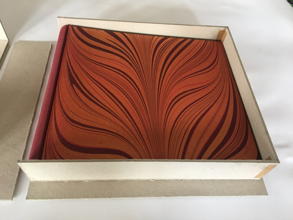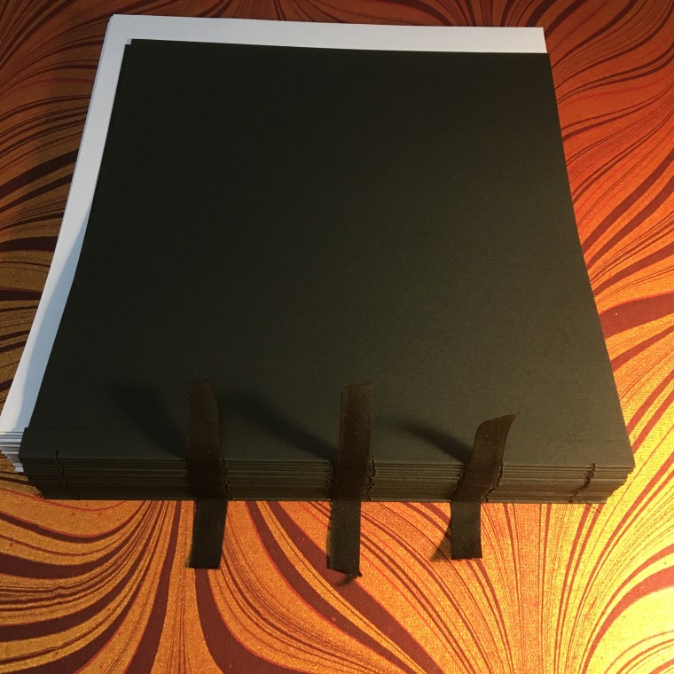Realització enquadernació per fer un àlbum de fotos per la celebració de les «Bodas de oro». Tapa solta cosida amb telar i cintes, llom rodó. A continuaió un estoig per reservar i preservar l’ àlbum.
