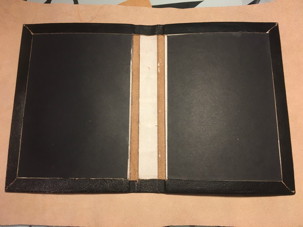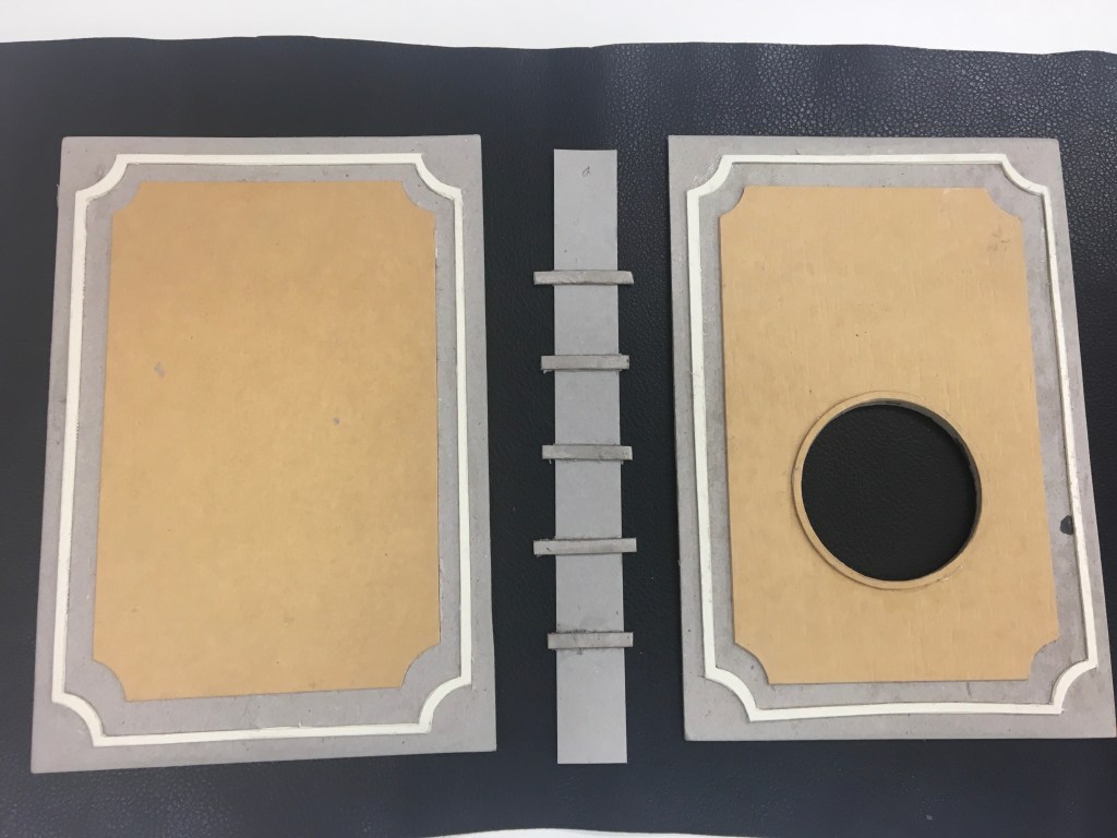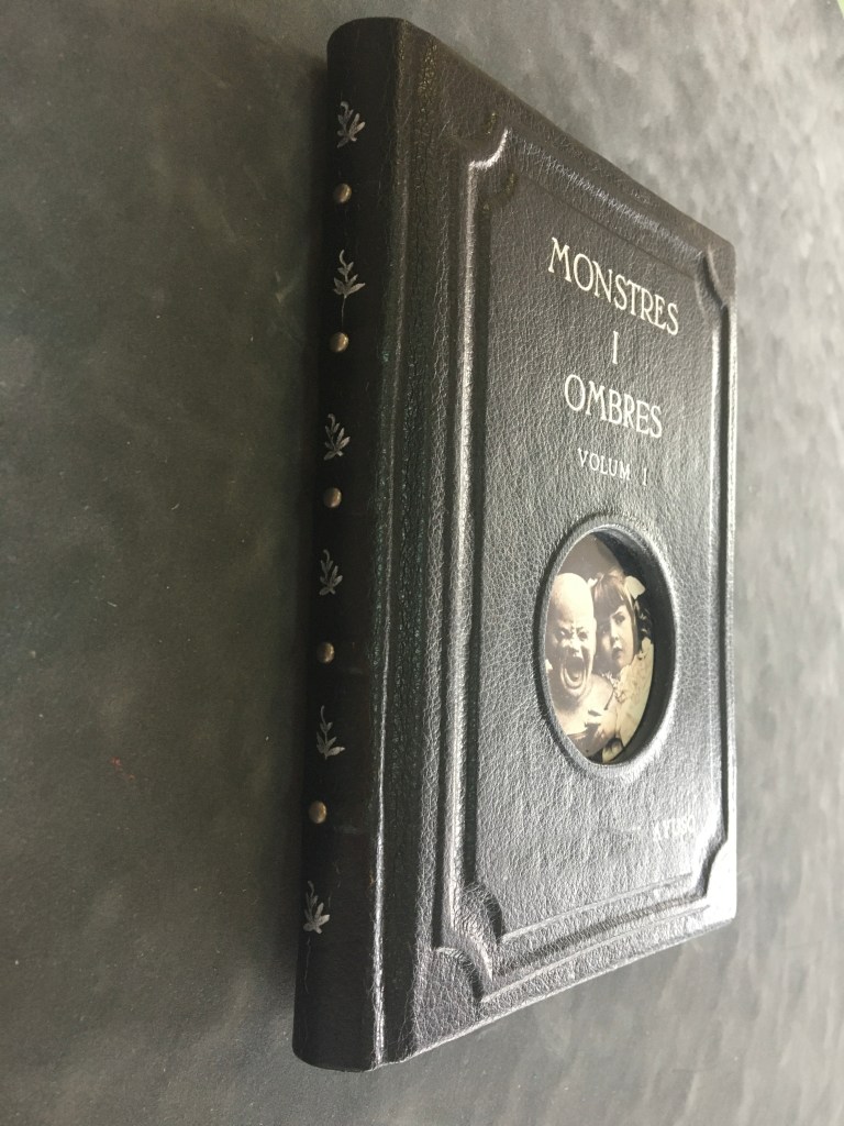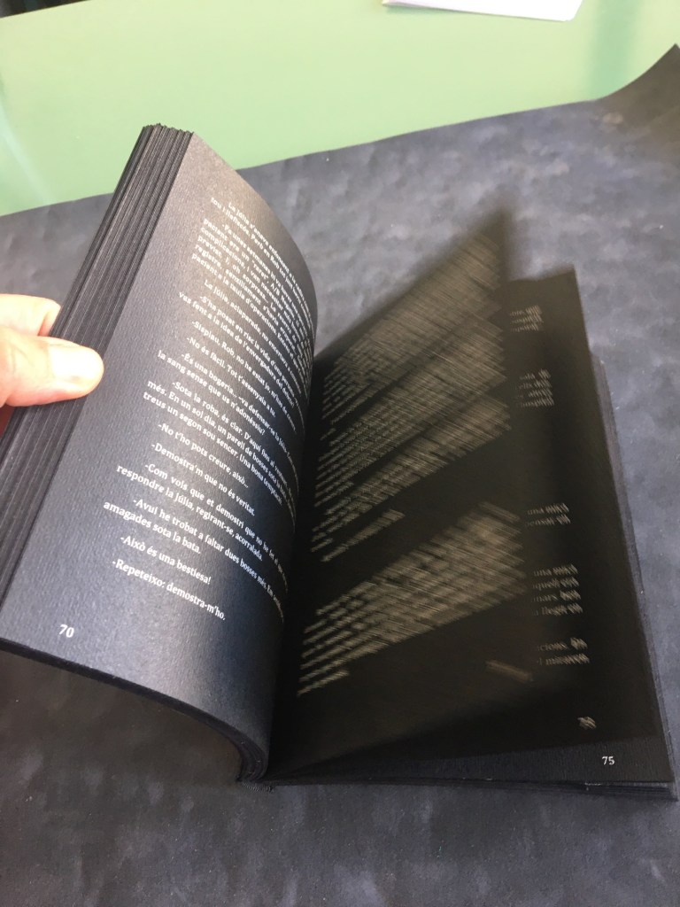 Realització d’una enquadernació de tapa solta amb nervis cosida amb cintes i telar. Es tracta de fer una enquadernció estil medieval per una novel.la de misteri, es per aixó que s’ha imprès el text en negatiu.
