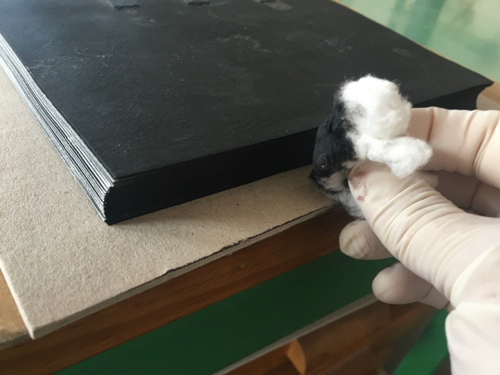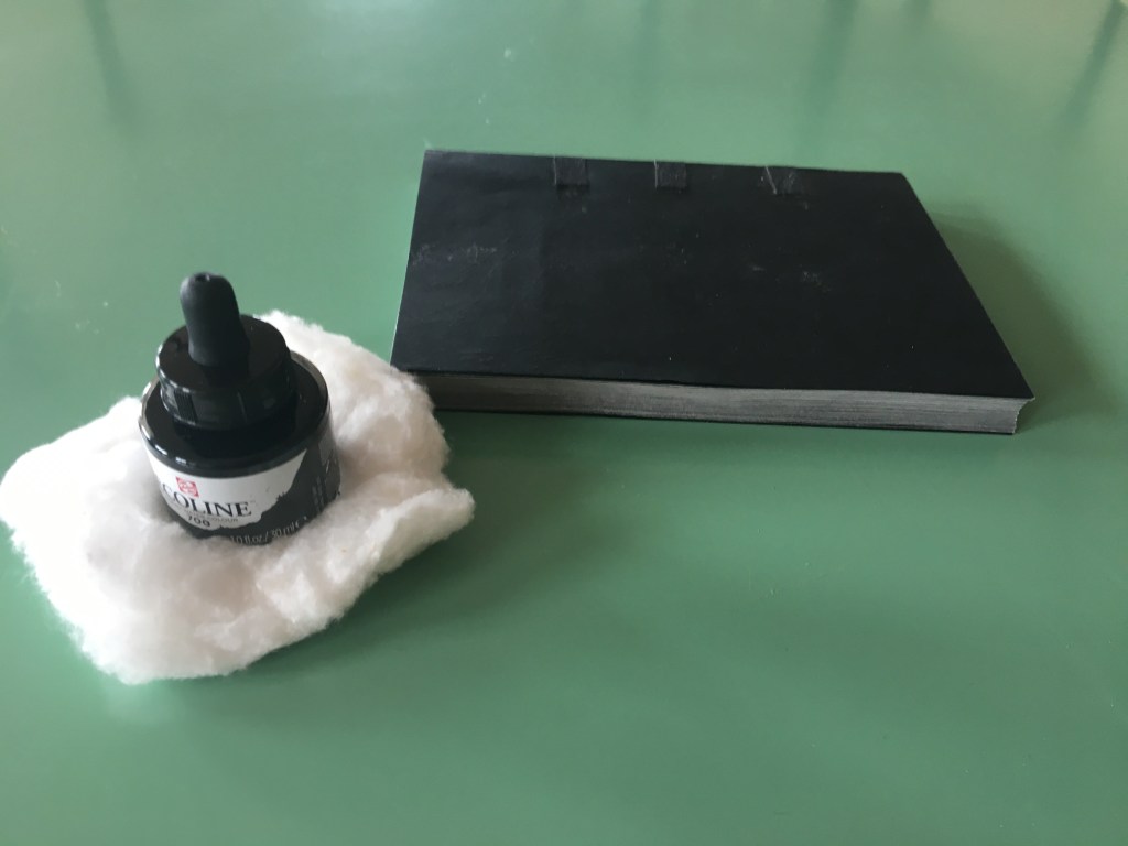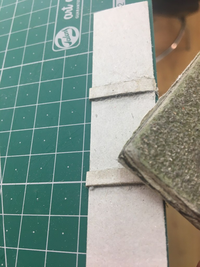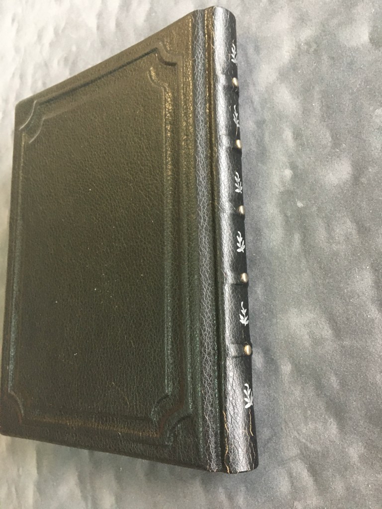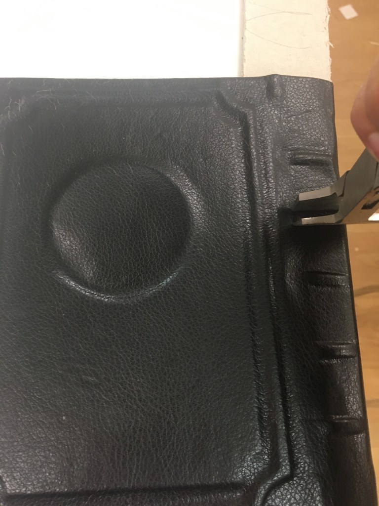Realització d’una enquadernació de tapa solta amb nervis cosida amb cintes i telar. Es tracta de fer una enquadernció estil medieval per una novel.la de misteri, es per aixó que s’ha imprès el text en negatiu.