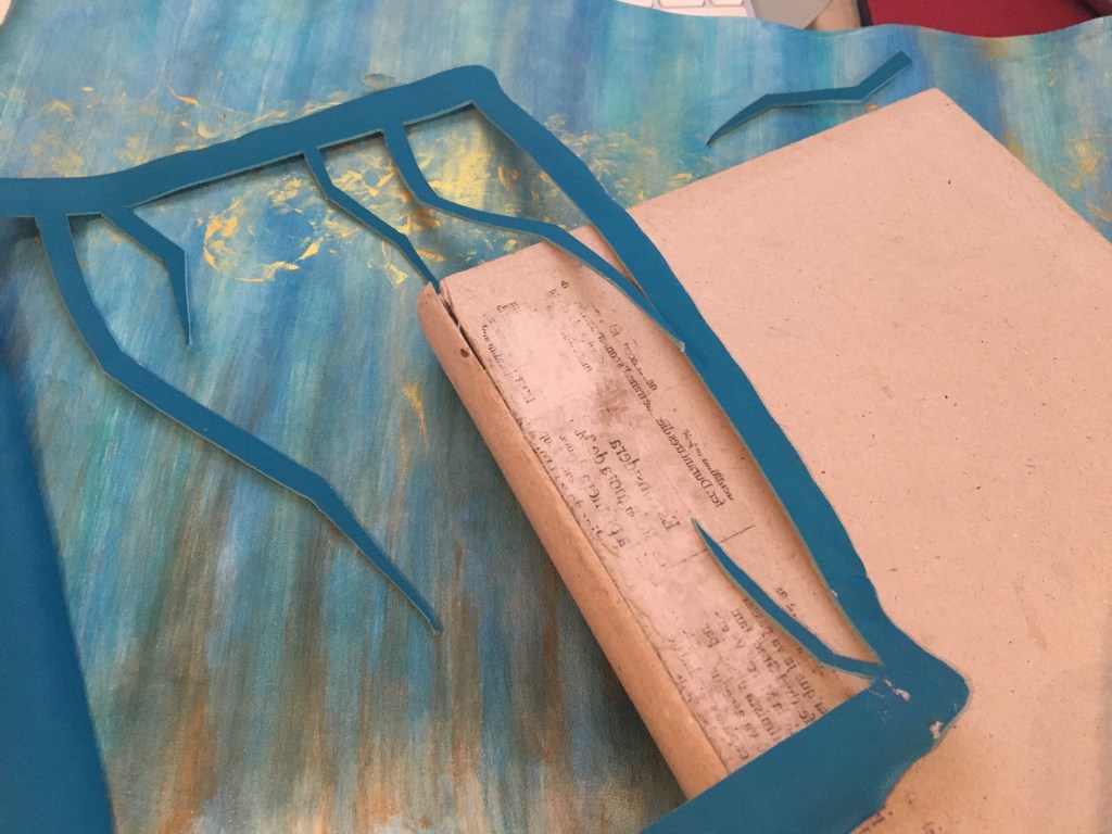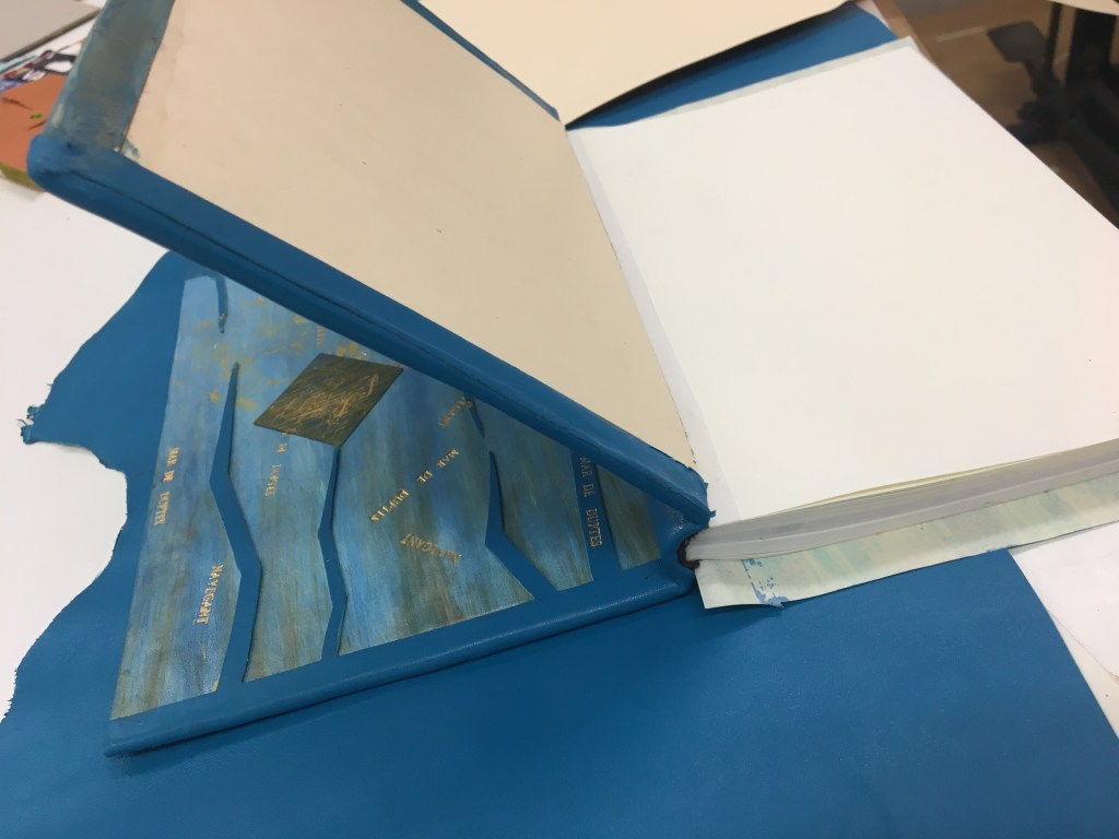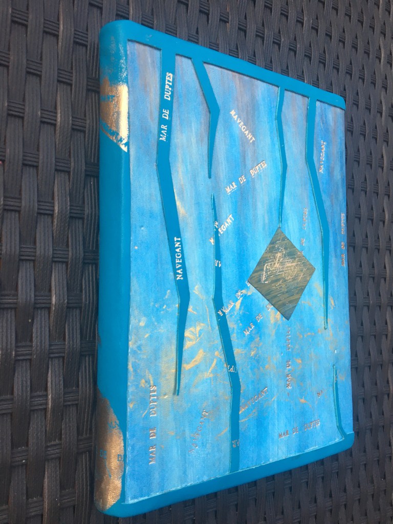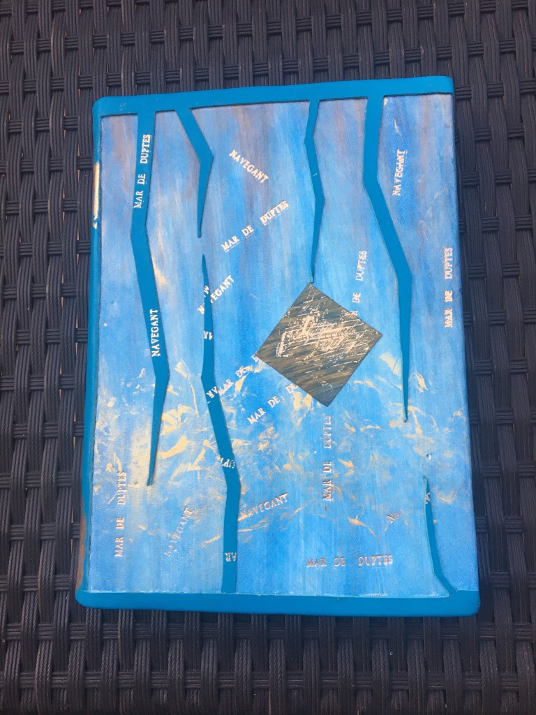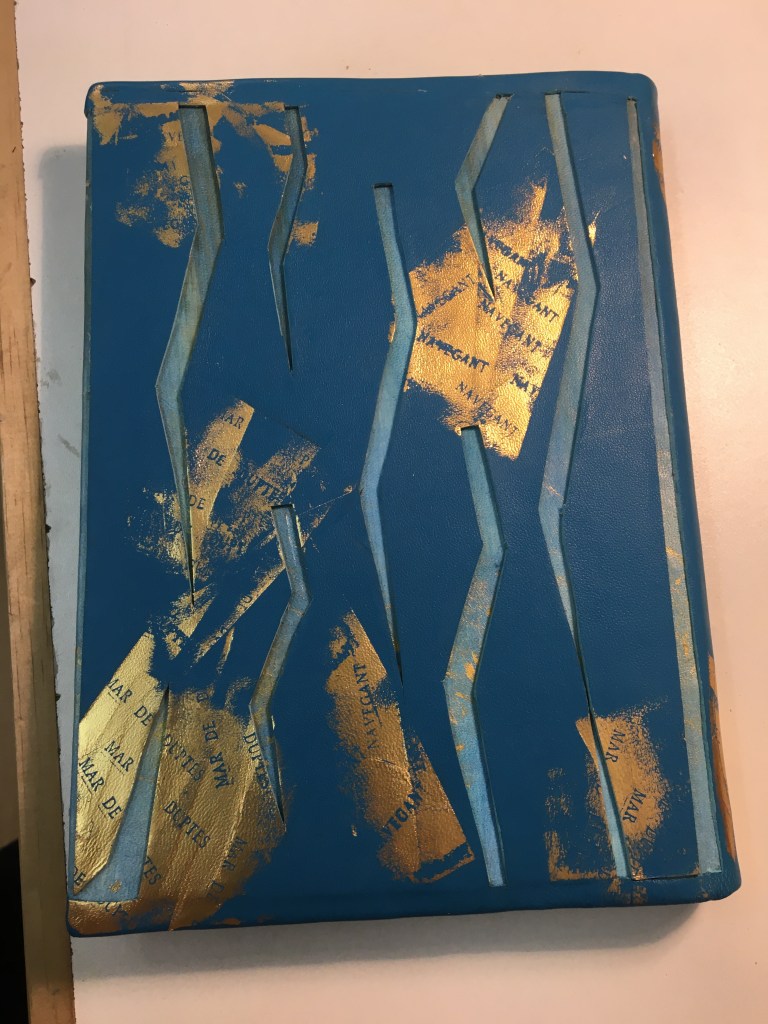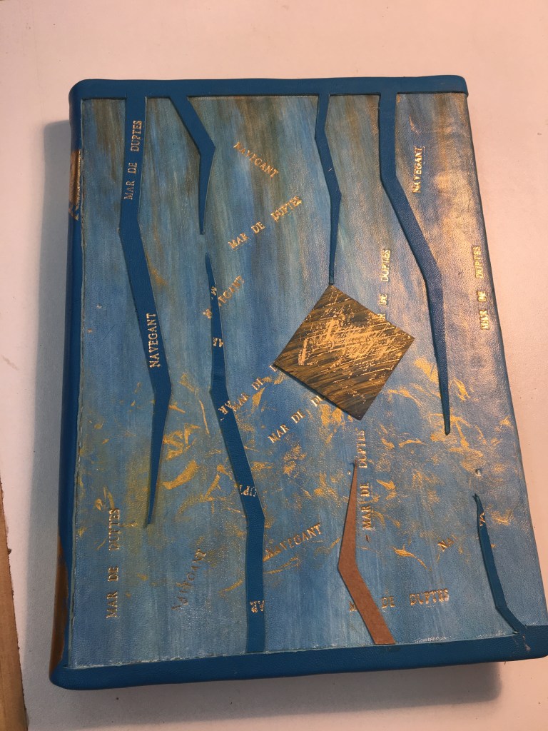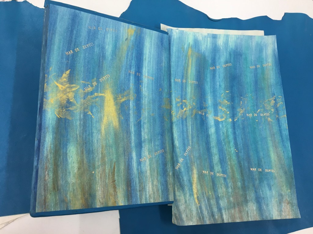 Realització d’una enquadernació amb tapa muntada i folrada amb pell. M’agraden les tècniques!, per això he tintat les guardes amb anilines a l’alcohol. Les portades estan troquelades. Amb la màquina de tall he realitzat talls en un cartó que posteriorment m’ha servit com a guia per fer el muntatge de positiu negatiu.