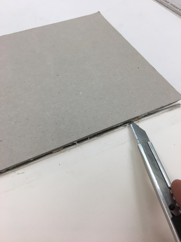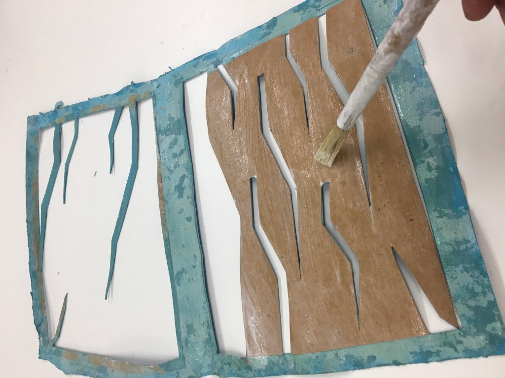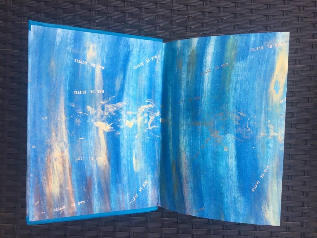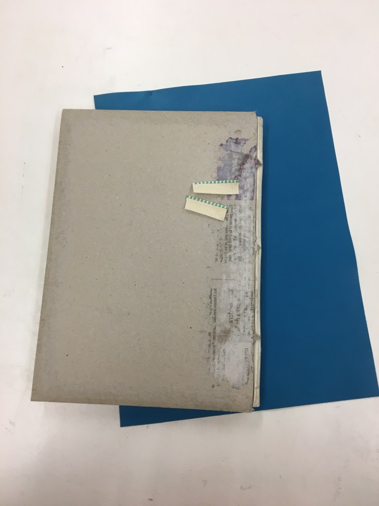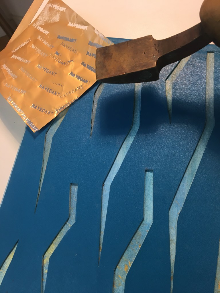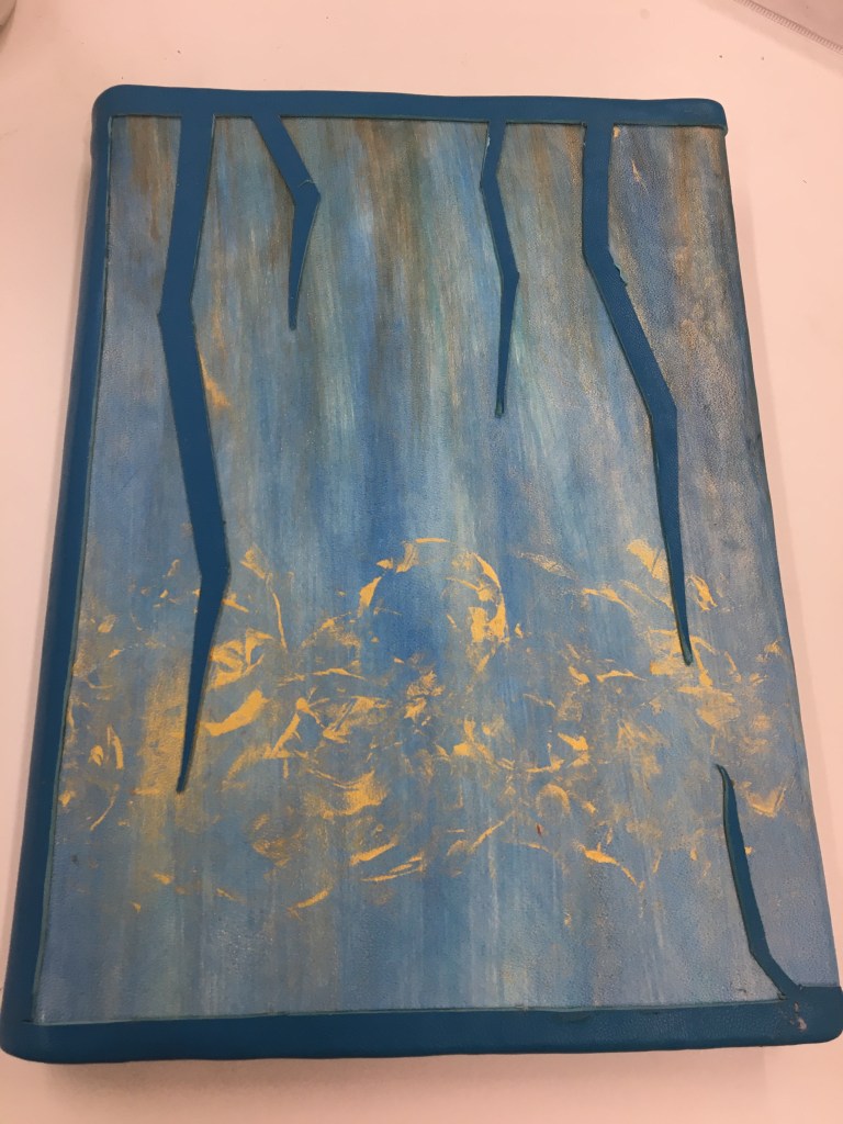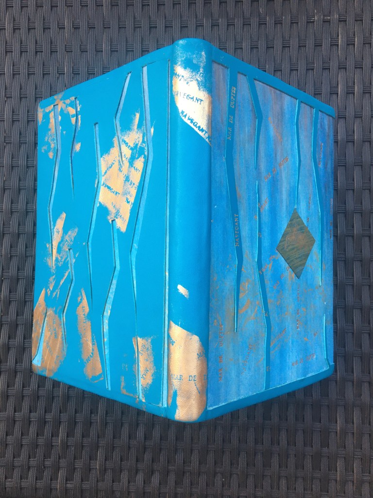 Realització d’una enquadernació amb tapa muntada i folrada amb pell. M’agraden les tècniques!, per això he tintat les guardes amb anilines a l’alcohol. Les portades estan troquelades. Amb la màquina de tall he realitzat talls en un cartó que posteriorment m’ha servit com a guia per fer el muntatge de positiu negatiu.