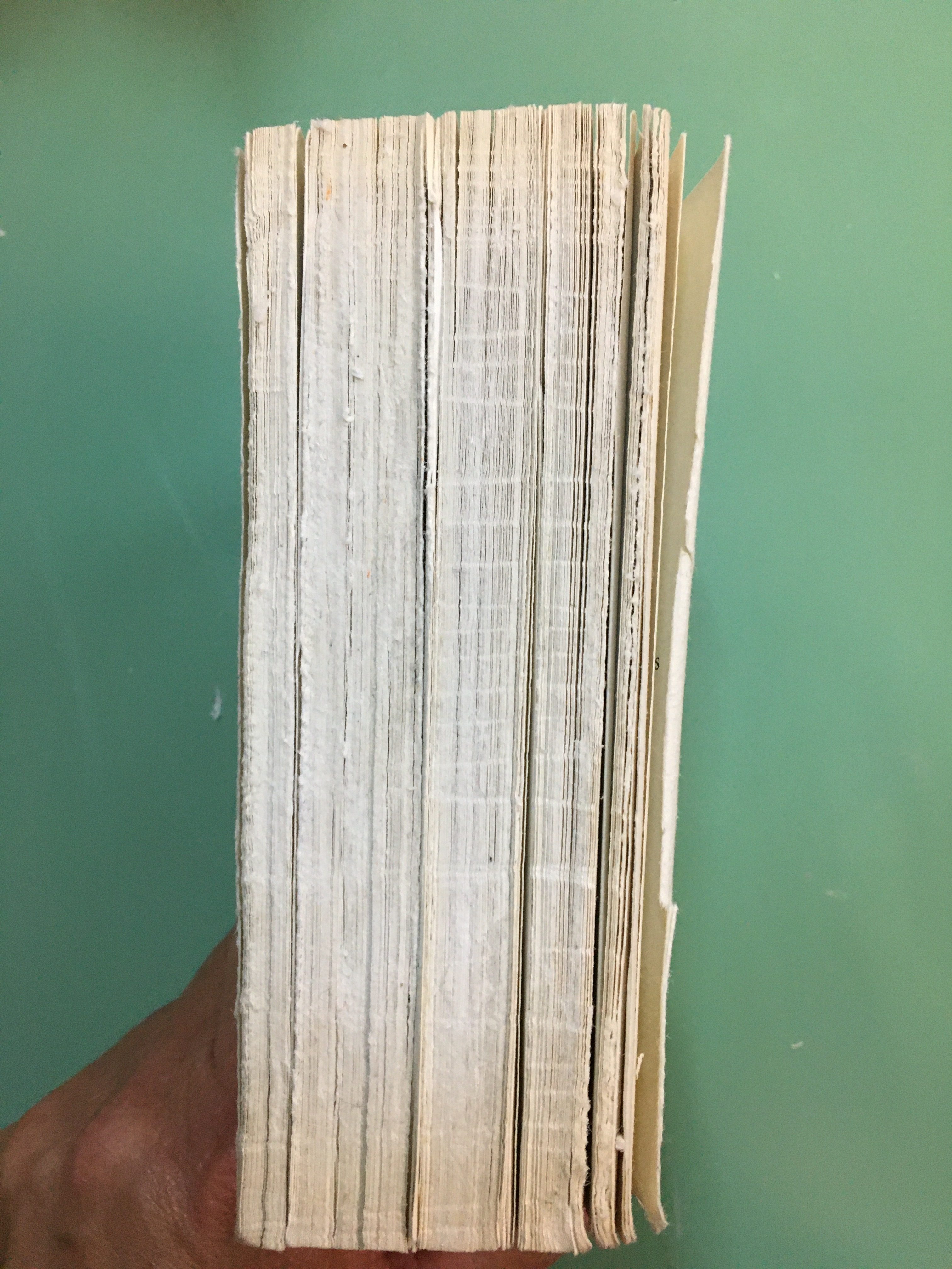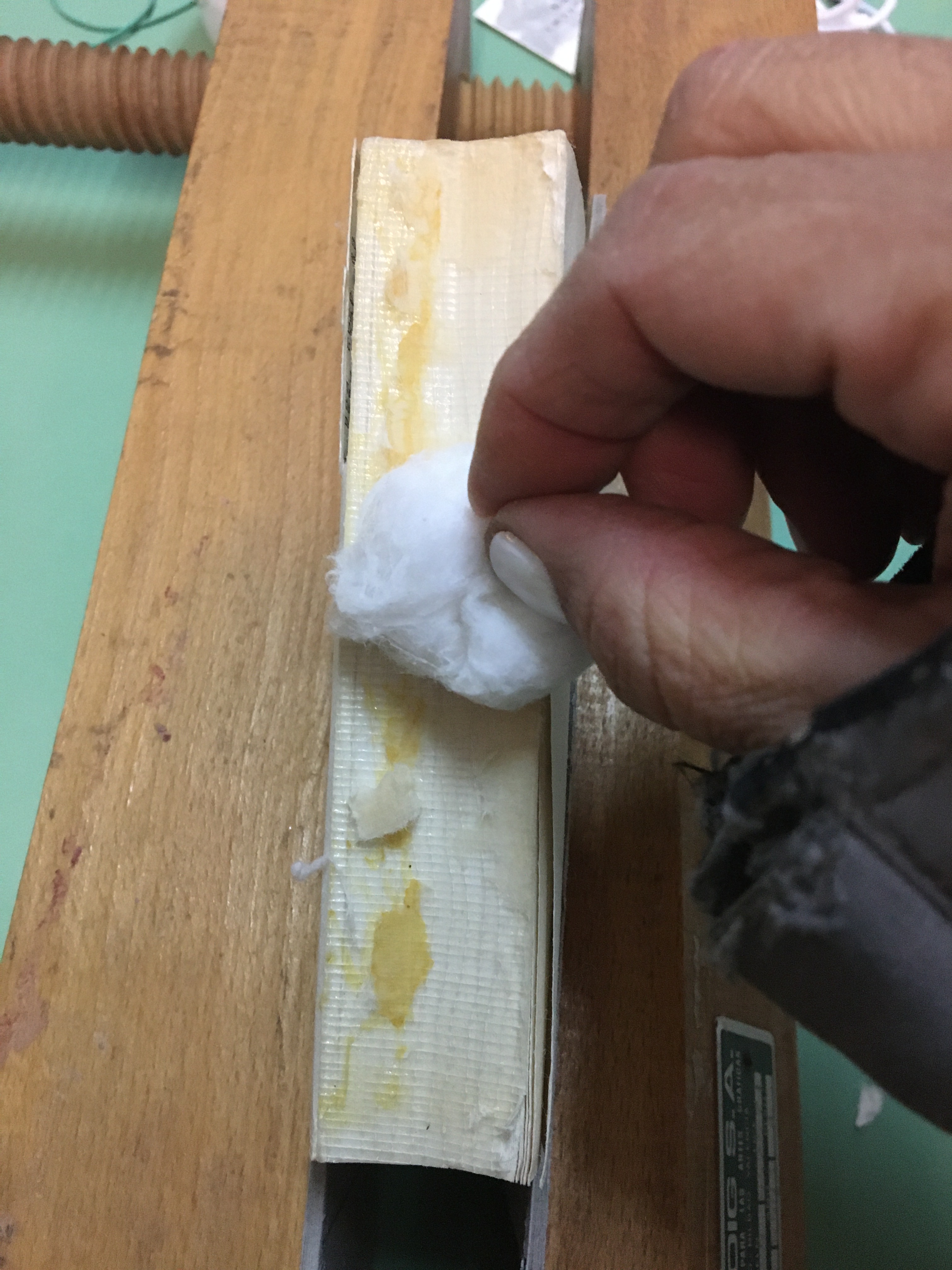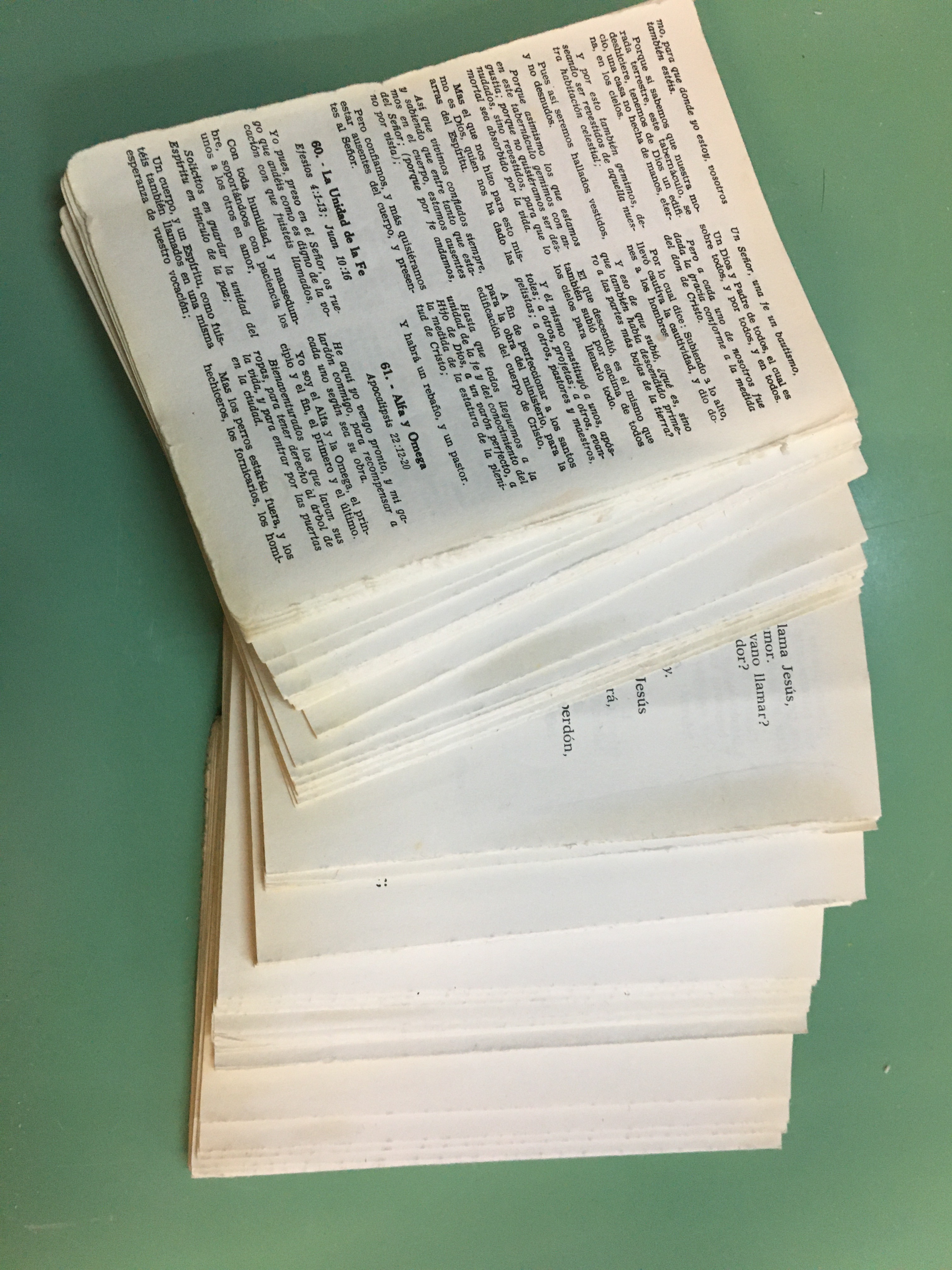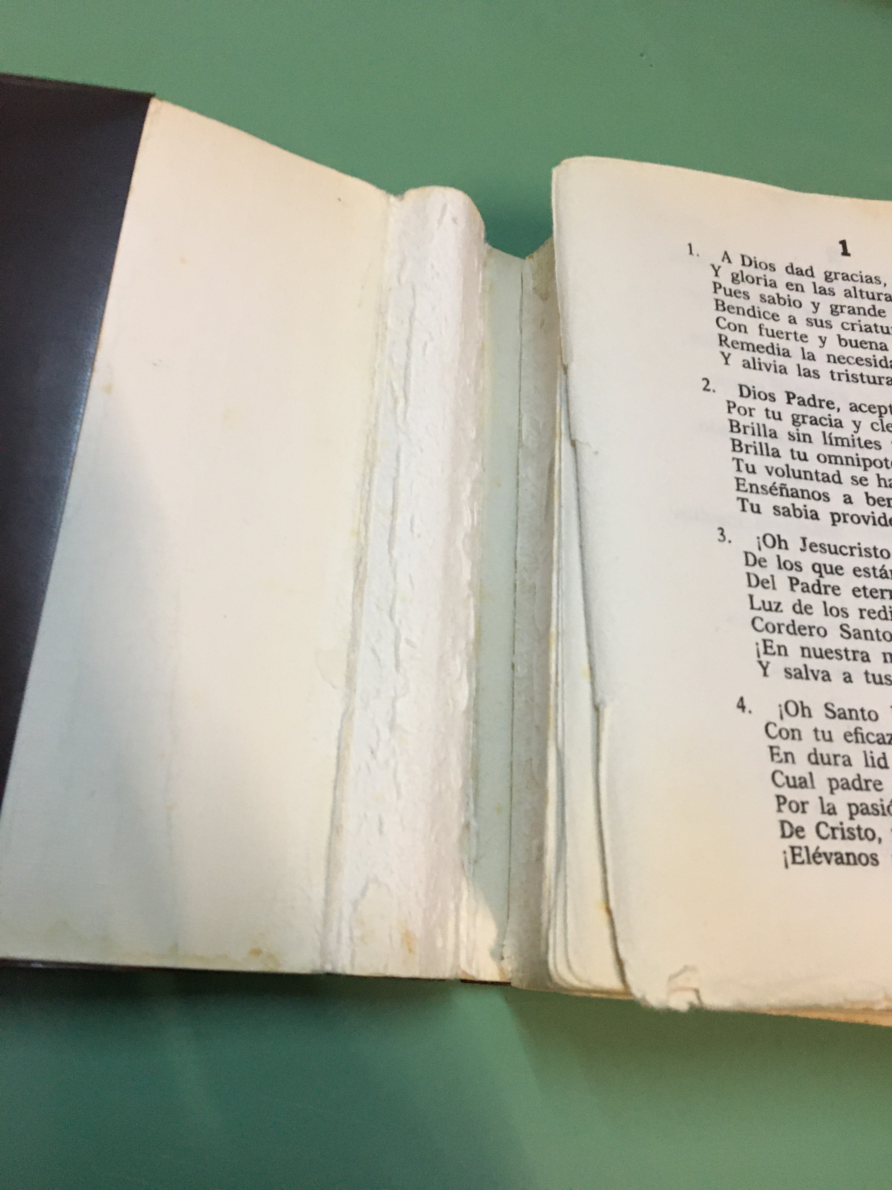 Amb cotó i alcohol vaig estovant la cola antiga per poder treure-la més facilment, fins a quedar sense gens de cola. He tenyit dos fulls blancs per donar un aspecte antic fins a aconseguir la mateixa tonalitat que els fulls de l’himnari, aquest pas m’agrada molt, queda molt bé. Una vegada s’han assecat encolo tota la tripa amb cola blanca per a després polir el tall perquè es vegi tot igualat. Ha quedat genial.