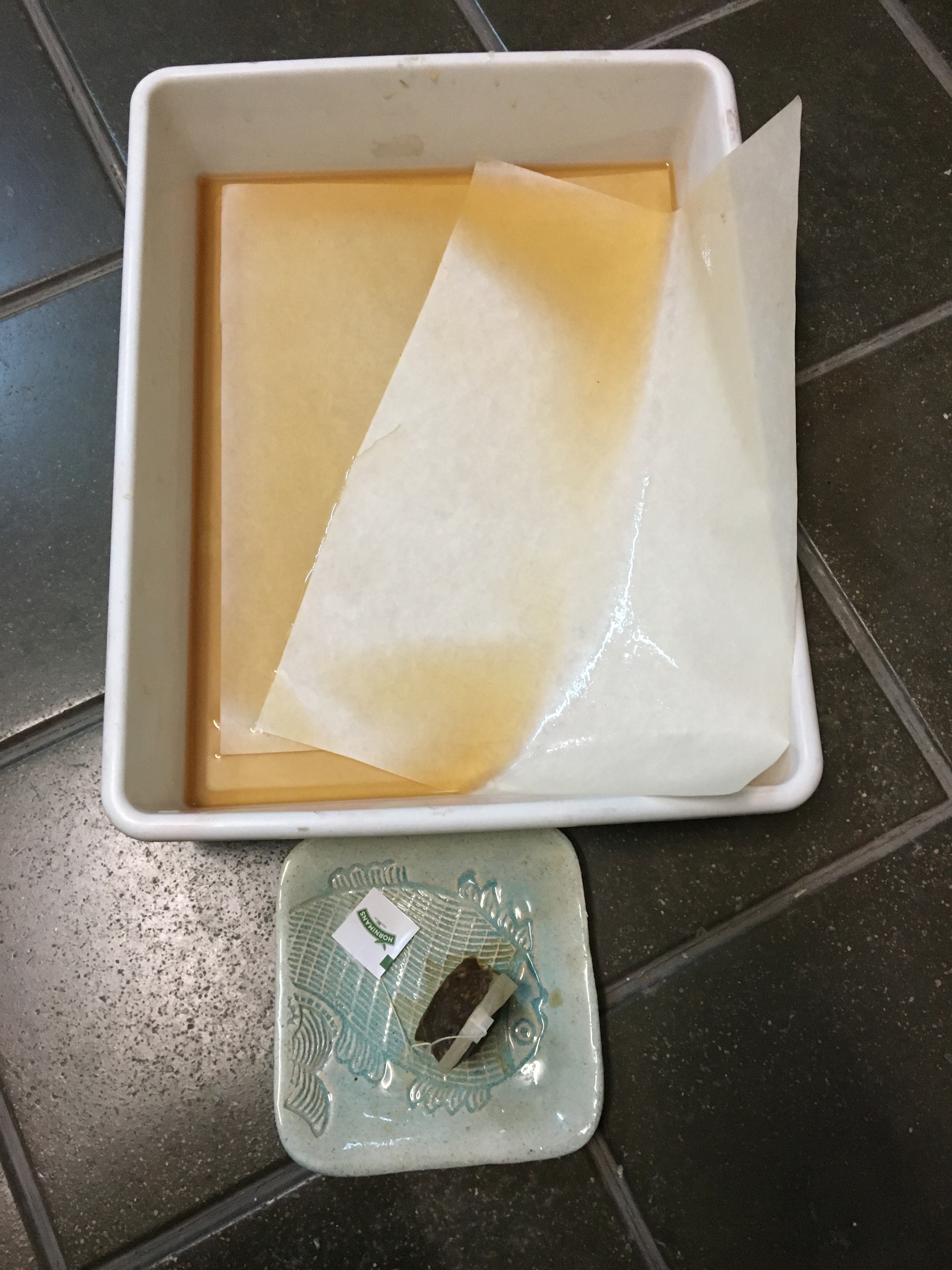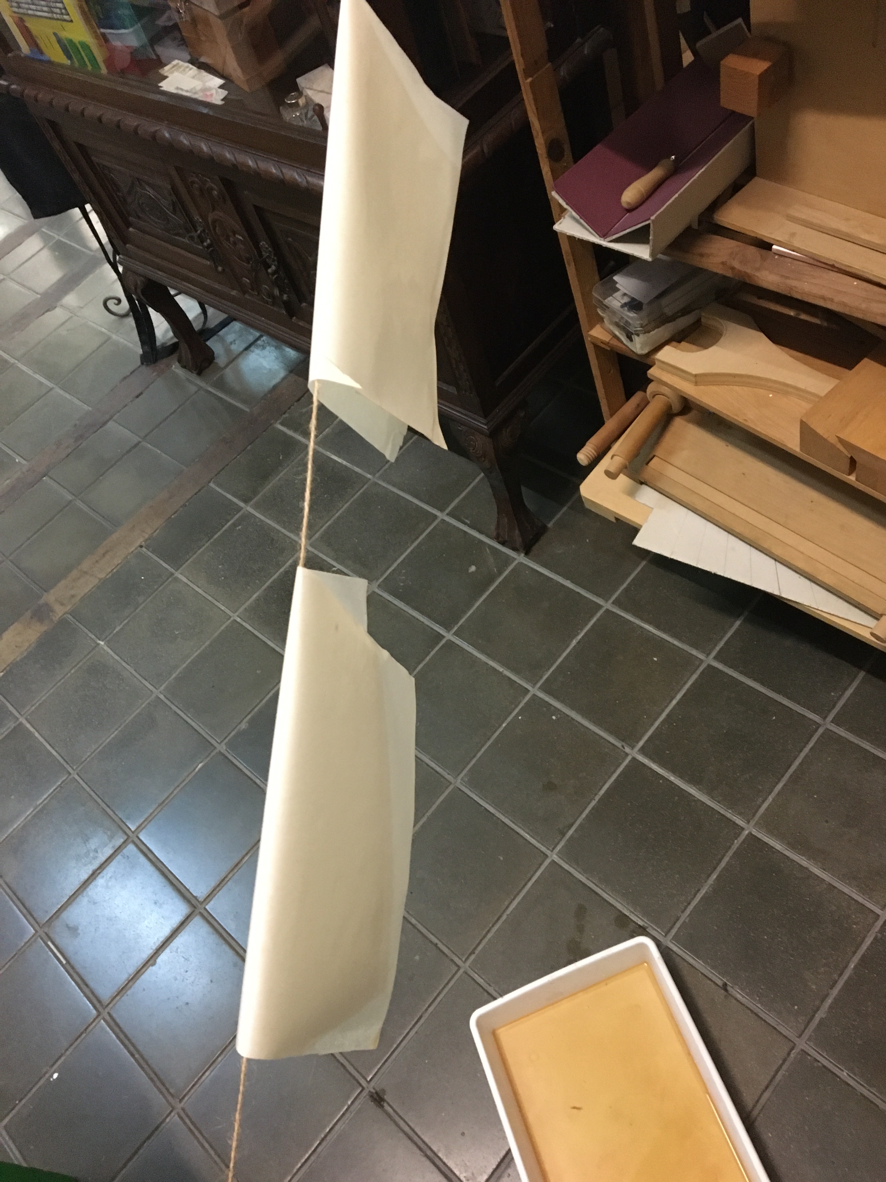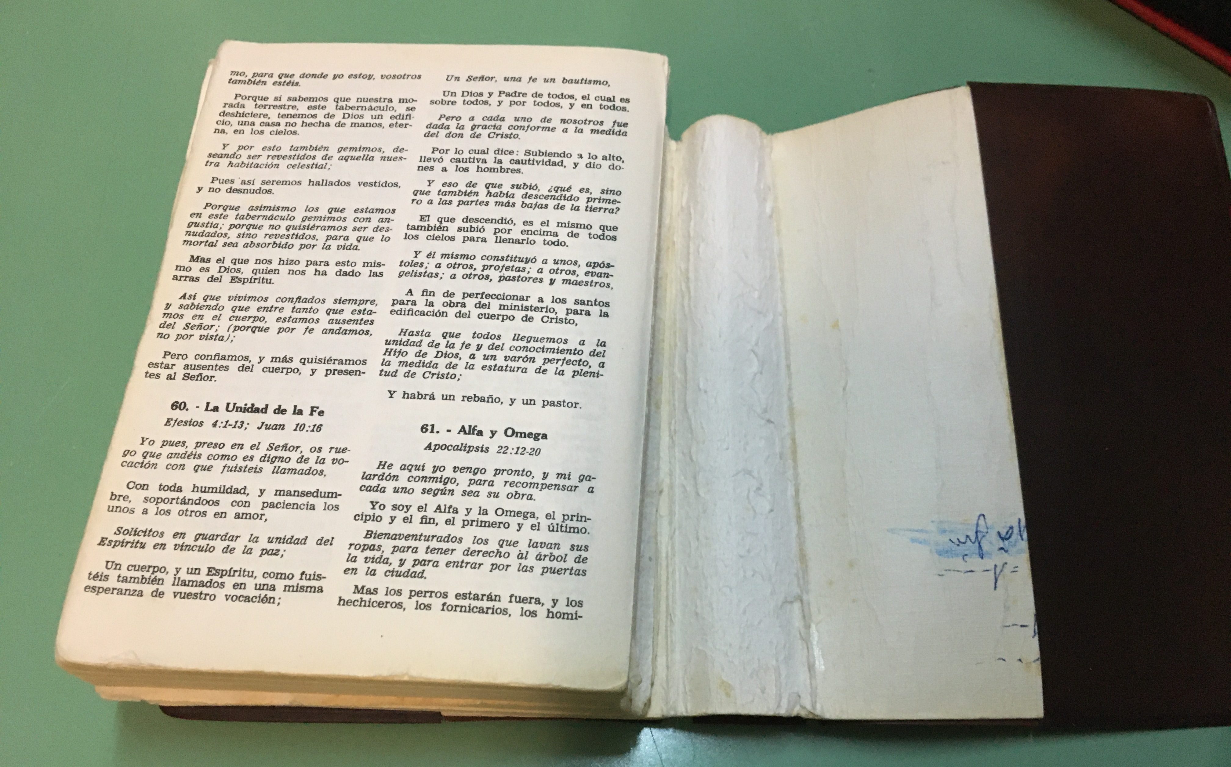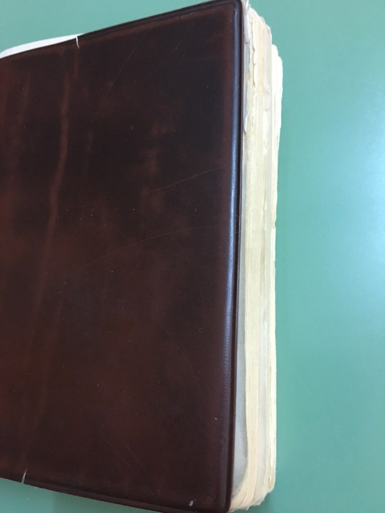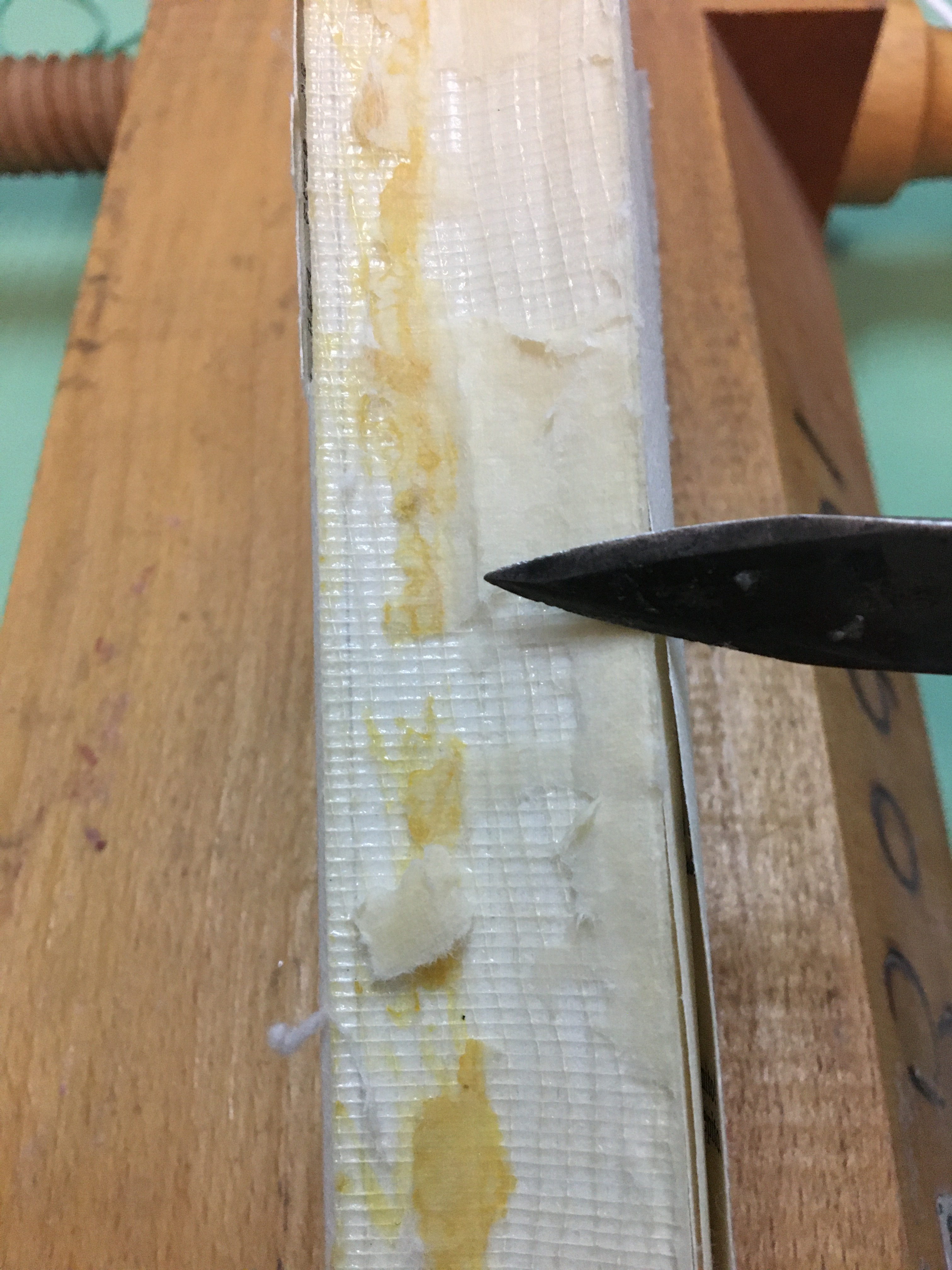 Amb cotó i alcohol vaig estovant la cola antiga per poder treure-la més facilment, fins a quedar sense gens de cola. He tenyit dos fulls blancs per donar un aspecte antic fins a aconseguir la mateixa tonalitat que els fulls de l’himnari, aquest pas m’agrada molt, queda molt bé. Una vegada s’han assecat encolo tota la tripa amb cola blanca per a després polir el tall perquè es vegi tot igualat. Ha quedat genial.