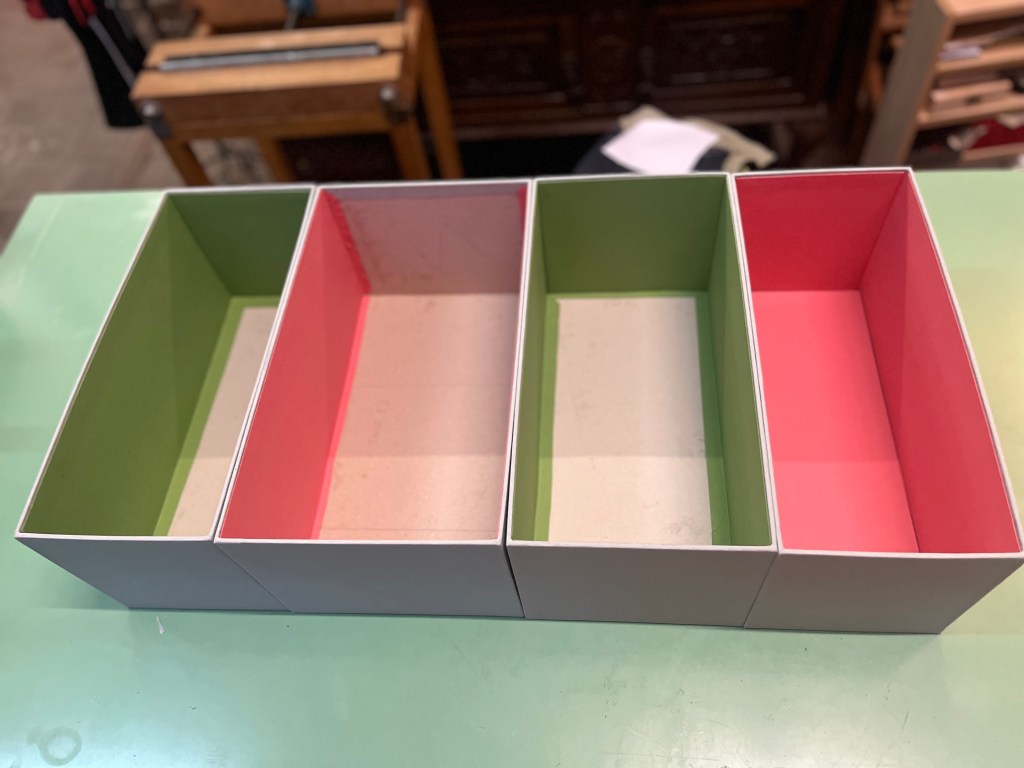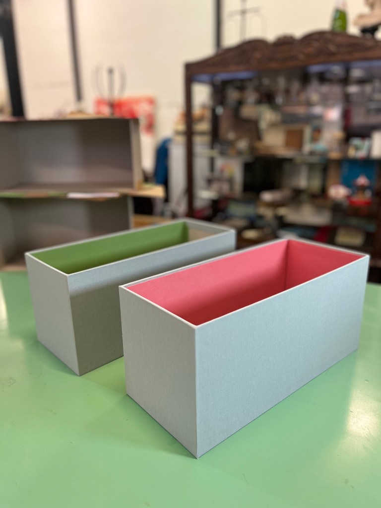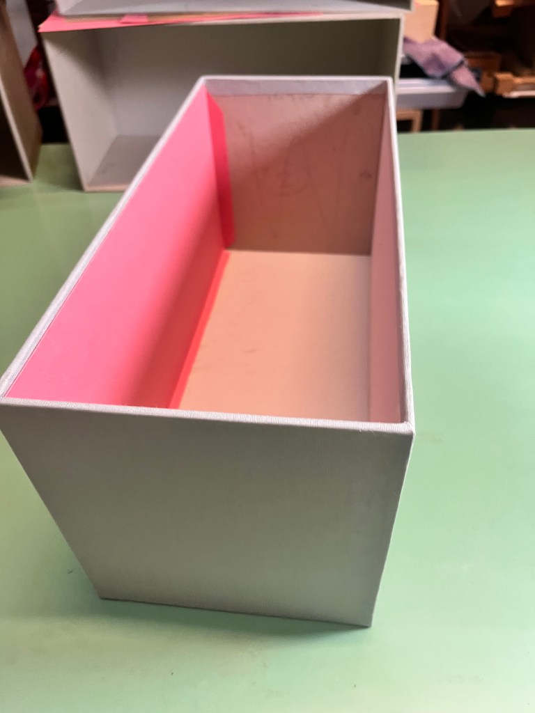 He realizado cuatro contenedores de cartón de 2,5 mm de grosor para guardar ropa en el armario. Para el exterior, he utilizado tela de la marca Cialux, comprada en An-Car (Barcelona), en un elegante tono gris perla. El interior está revestido con cartulina Canson de 250 g en colores rosa y verde. Esta cartulina, de excelente calidad, aporta un toque de color y un acabado más cuidado al conjunto.