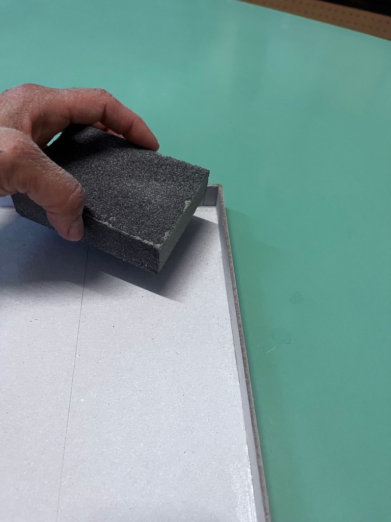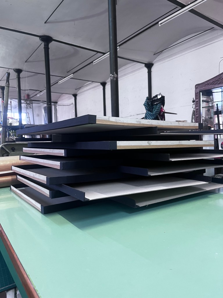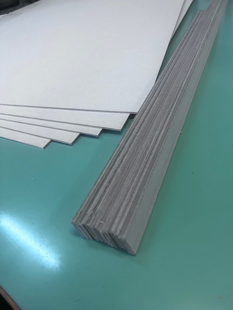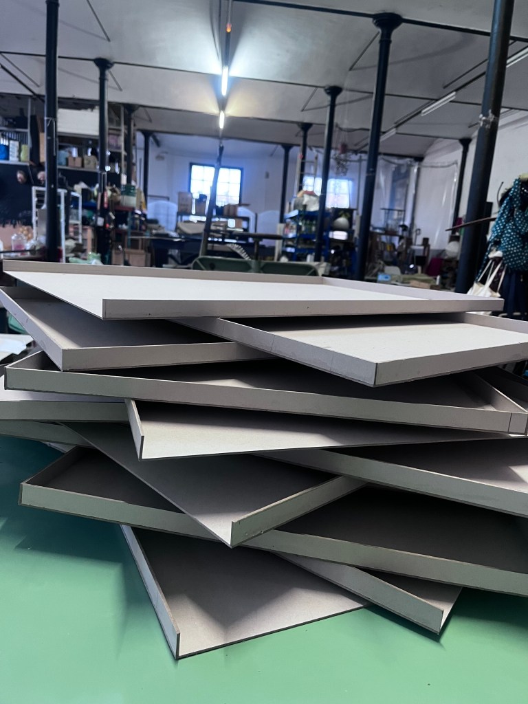 Se trata de un estuche de doble bandeja, de grandes dimensiones (80 cm x 50 cm), que debía ser resistente pero ligero. Para conseguirlo, utilicé cartón de 2,5 mm, un grosor ideal para asegurar estabilidad sin añadir un peso excesivo.