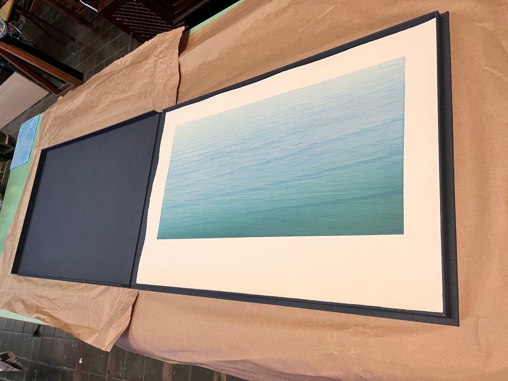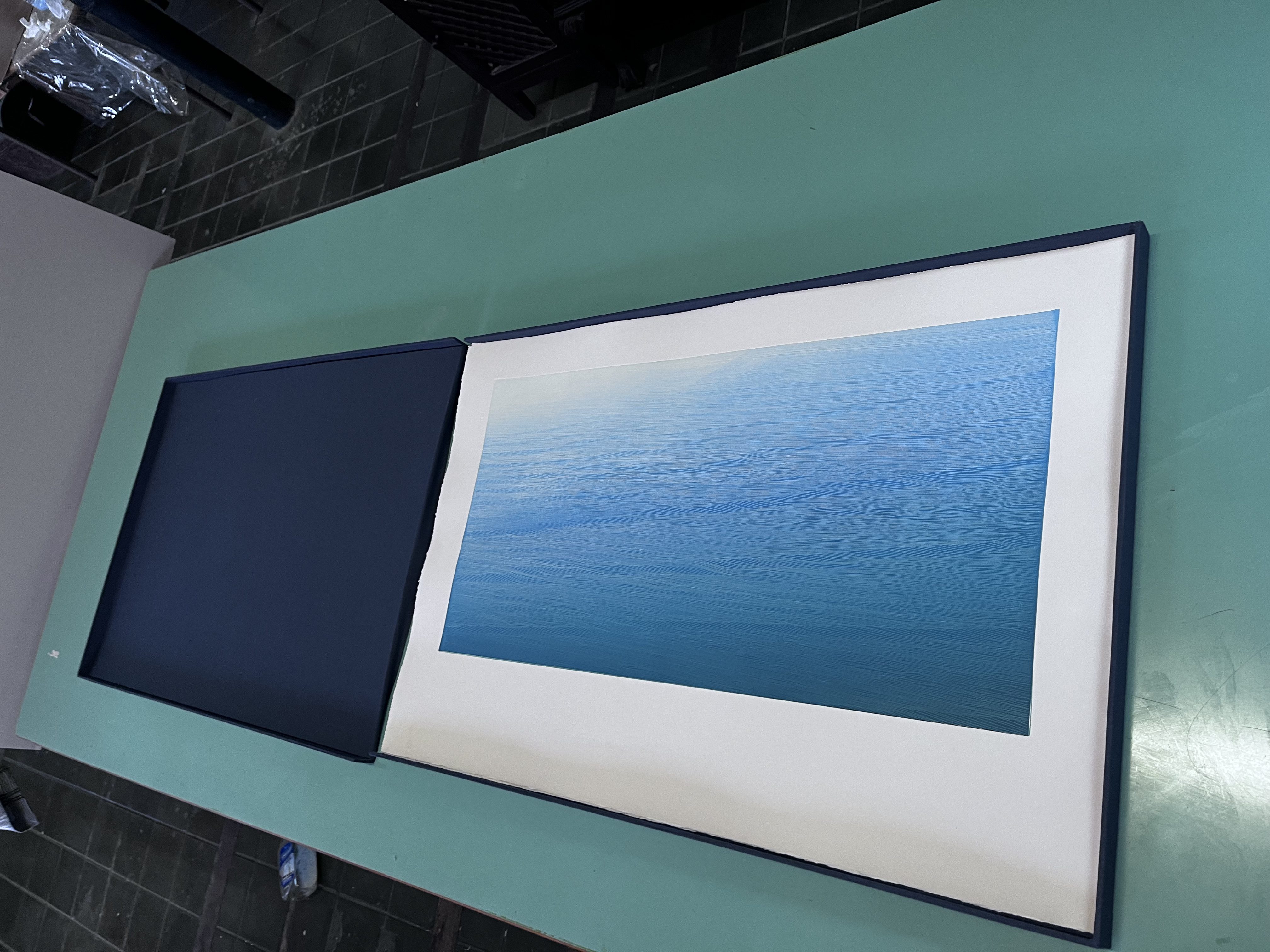 En mi taller de encuadernación y cartonaje artesanal en Mataró he realizado recientemente un trabajo muy especial: un estuche a medida para encuadernación, pensado para proteger y presentar cinco grabados originales con el título «Water Customs» del artista Juan Escudero.