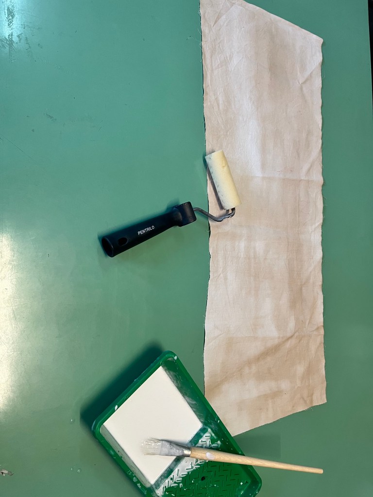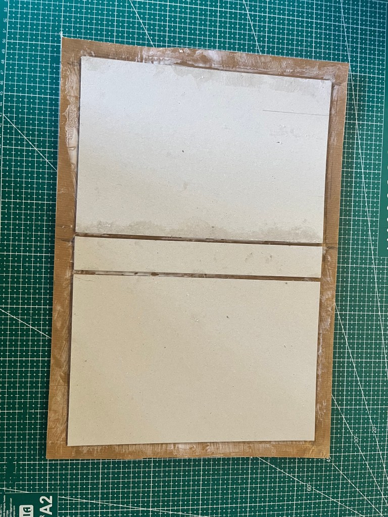 El primer paso fue laminar la tela con papel Kraft, preparando el lienzo para esta aventura. Dada la necesidad de respetar el mínimo margen izquierdo del manuscrito, la opción ideal no fue una encuadernación tradicional, sino un Estuche Doble Bandeja, perfecto para la conservación y el encapsulamiento artesanal de piezas únicas.