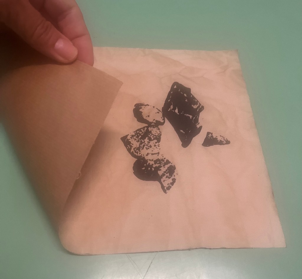 Este material tan valioso necesitaba un contenedor que estuviera a su altura, un cuerpo que le diera personalidad y lo protegiera. Noelia me confió una tela de algodón teñida con café y serigrafiada con una imagen especial, el punto de partida perfecto para una encuadernación creativa.