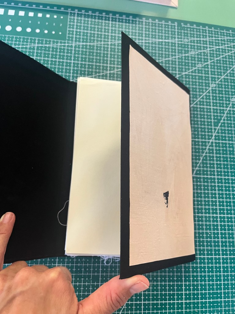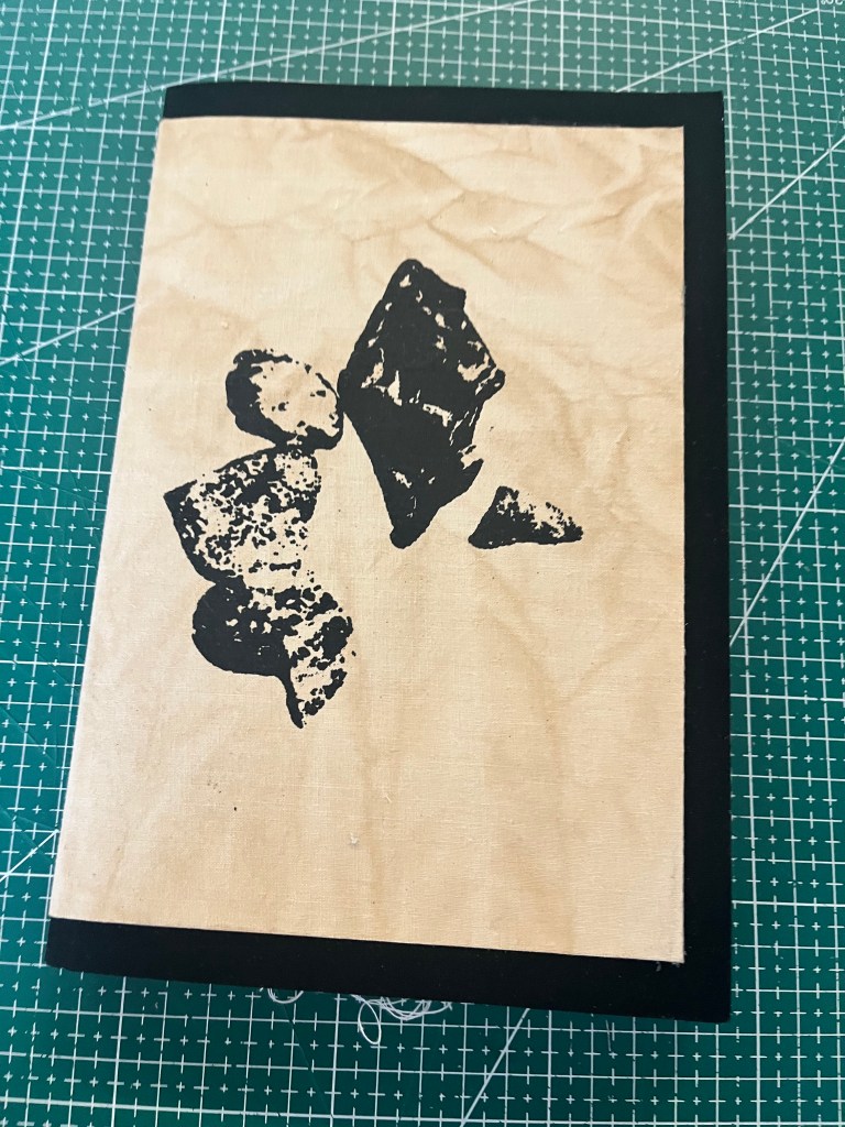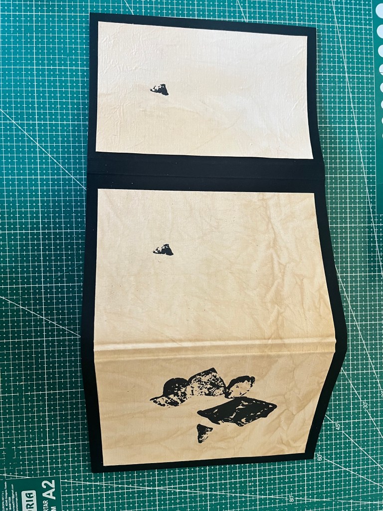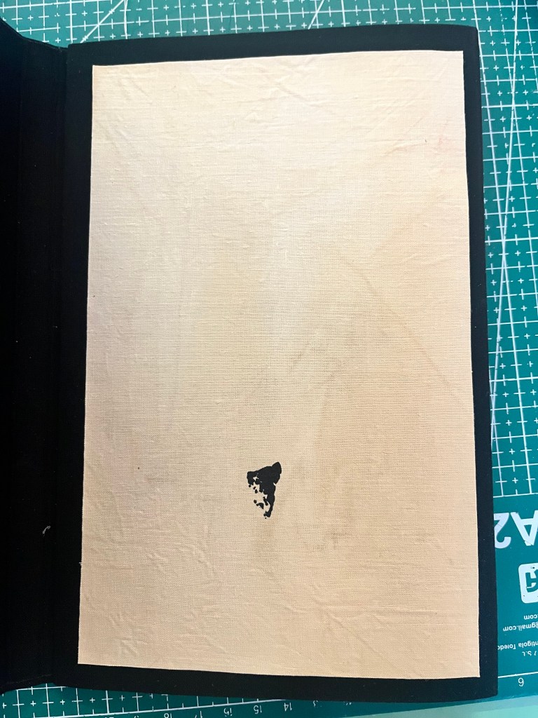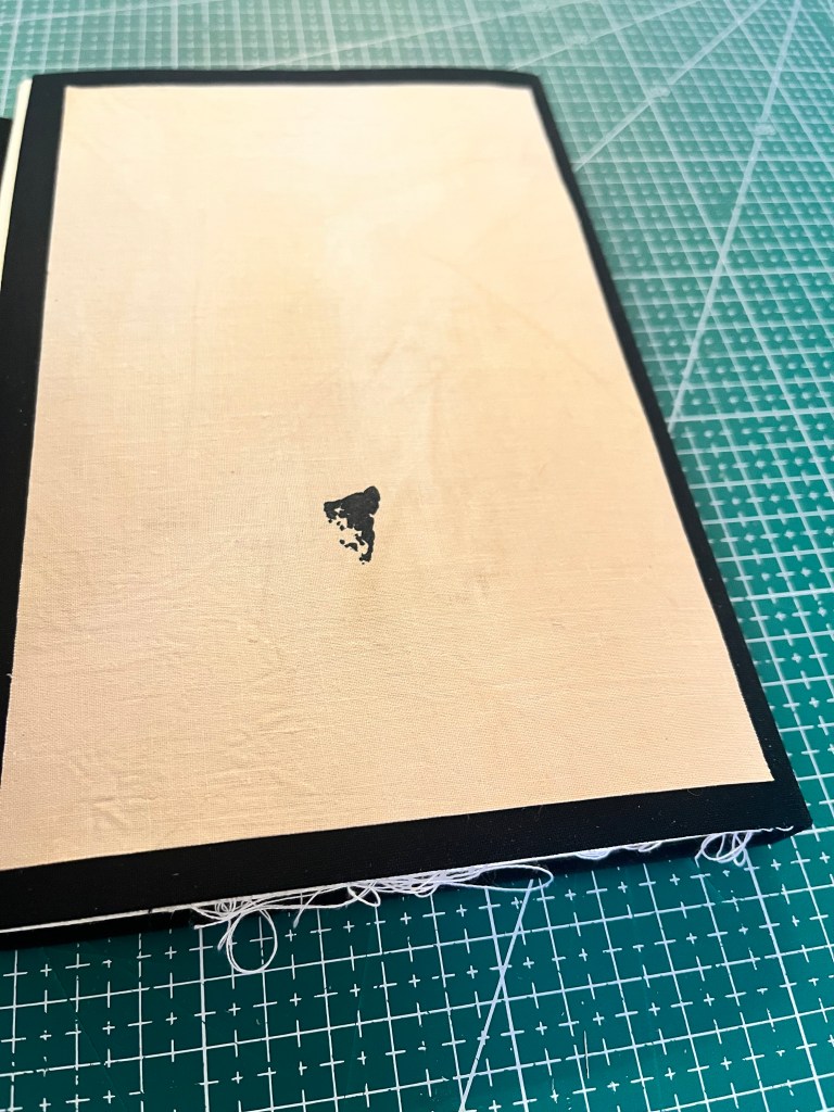 Las tapas se forraron con la tela teñida y serigrafiada que me entregó Noelia. En la portada cosí otro retazo de tela con el motivo negro, replicando el mismo cosido que une las fotografías internas.