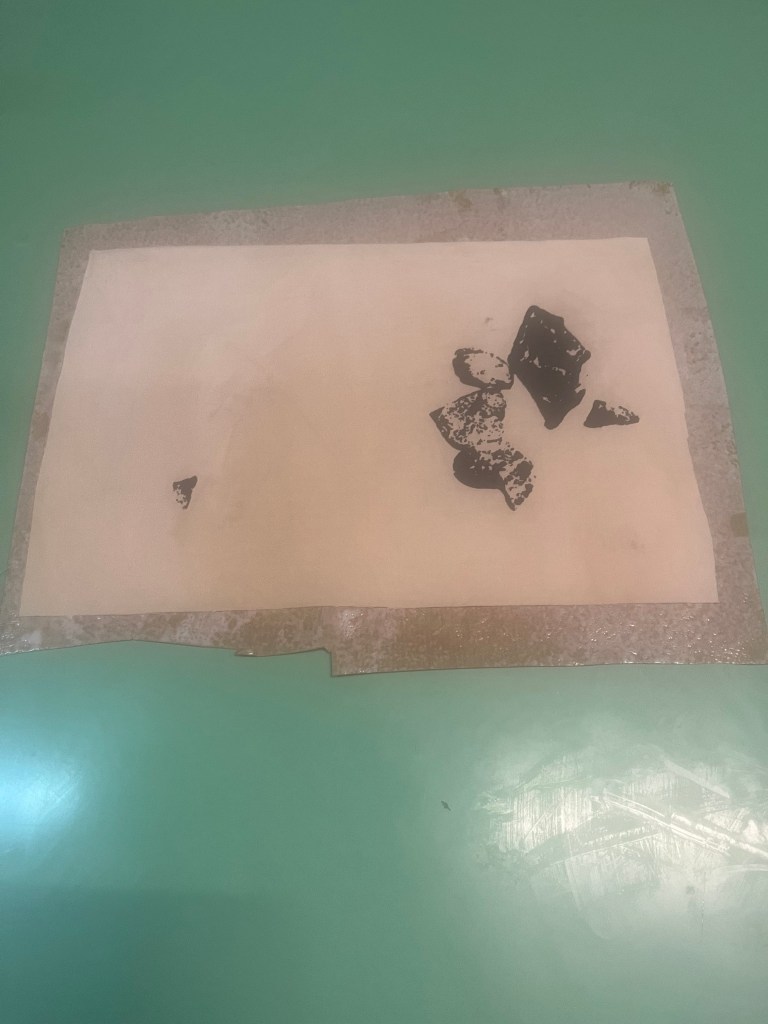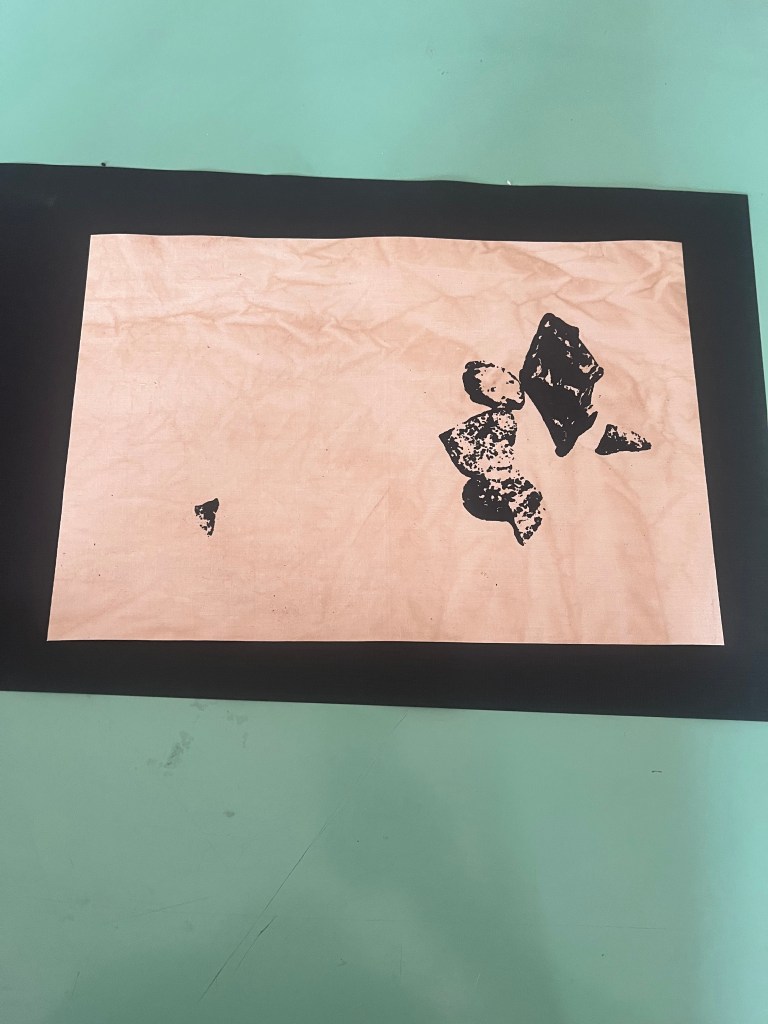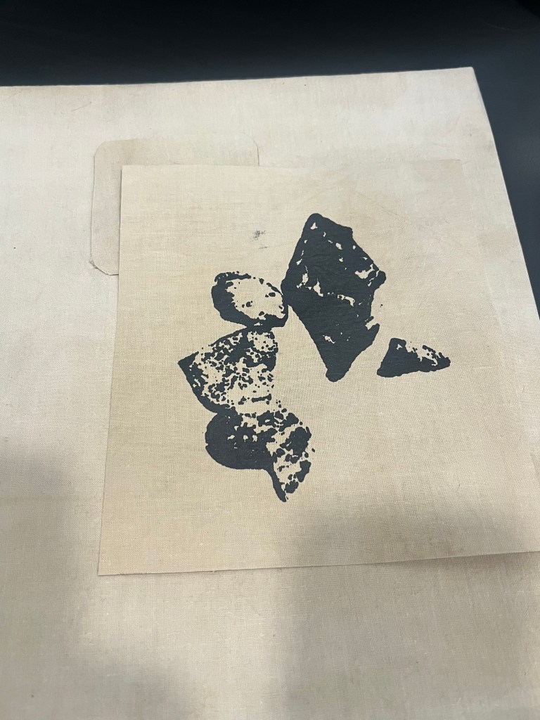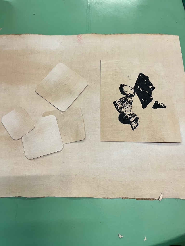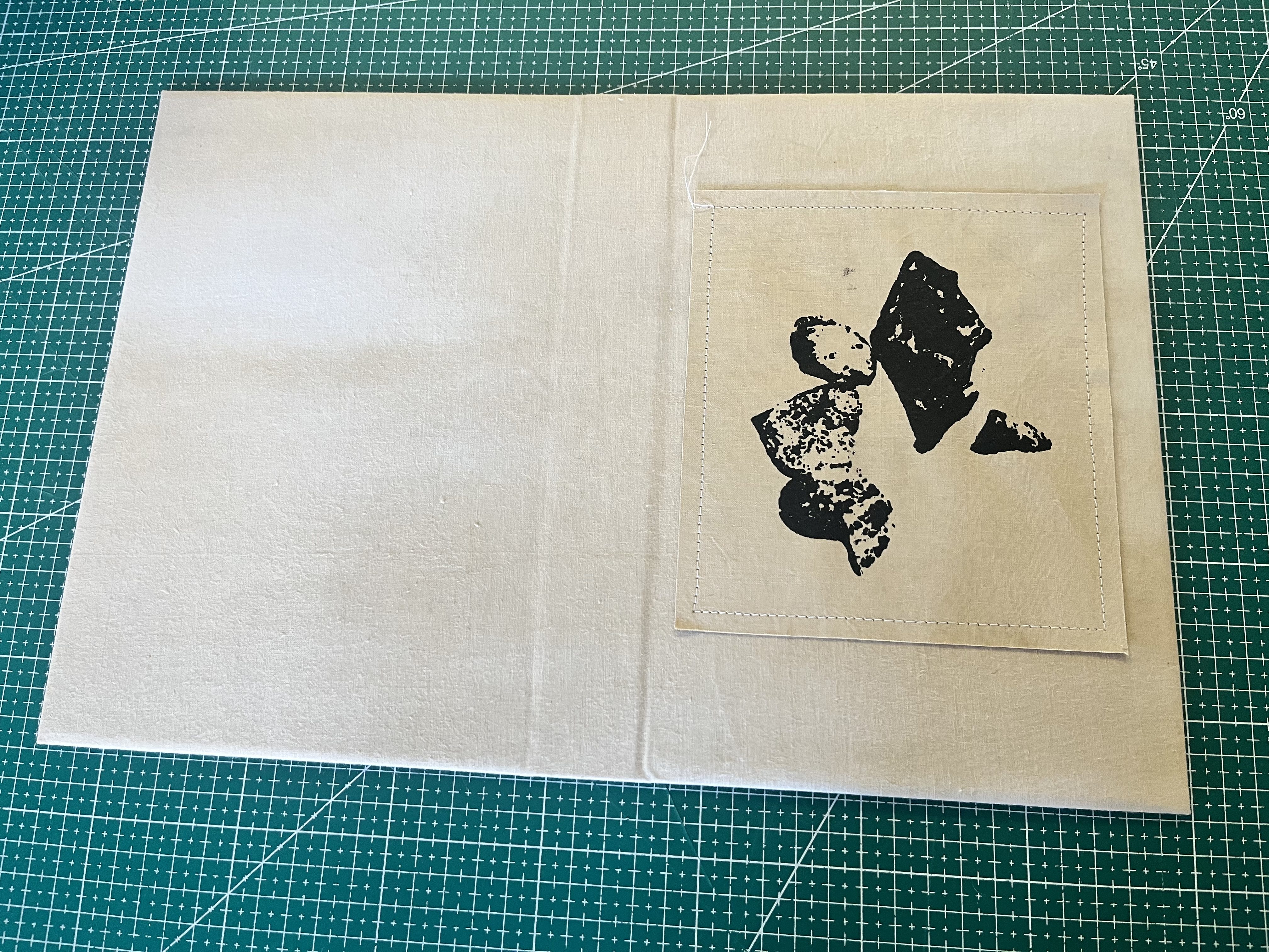 Las tapas se forraron con la tela teñida y serigrafiada que me entregó Noelia. En la portada cosí otro retazo de tela con el motivo negro, replicando el mismo cosido que une las fotografías internas.