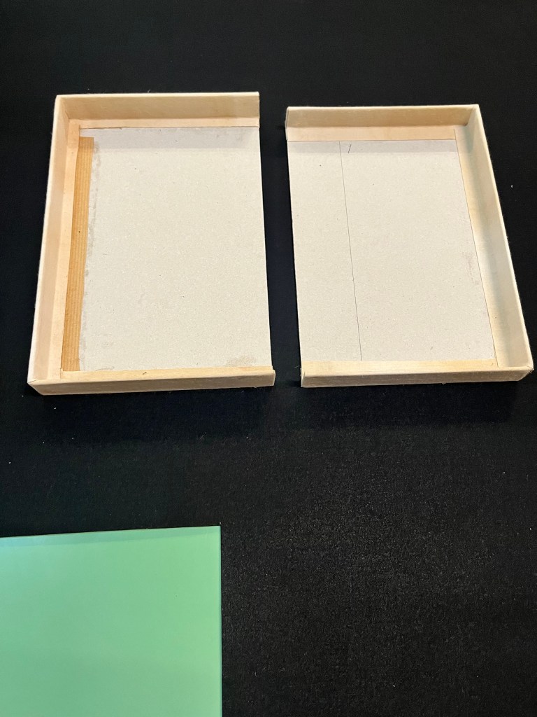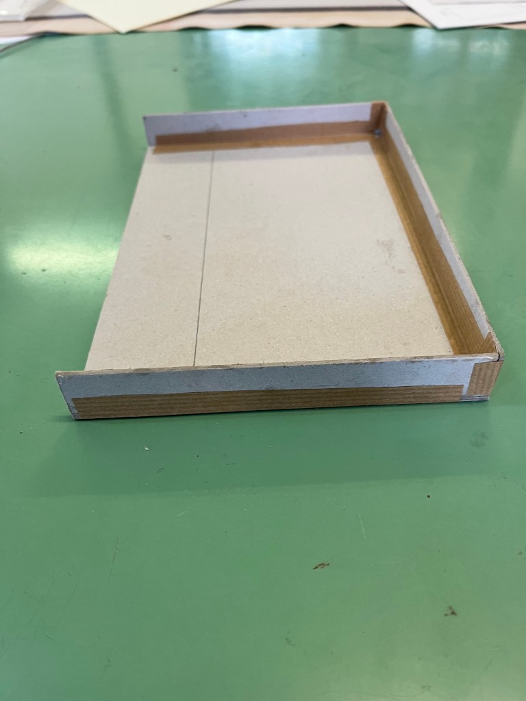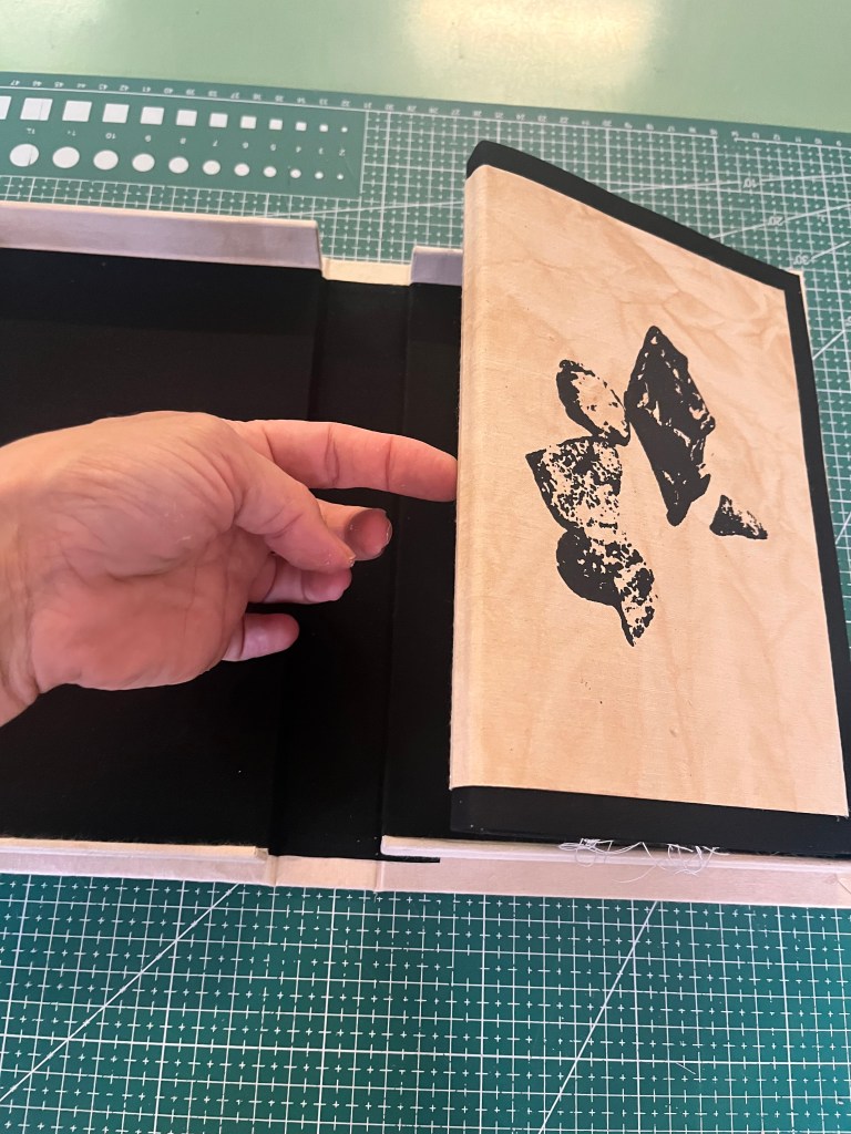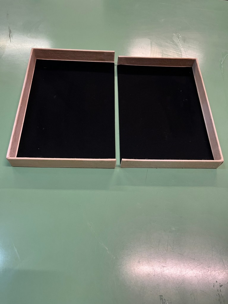 El contraste fue la clave en el forrado. Las bandejas se forraron con la tela laminada. Para el fondo interior, seleccioné una tela especial de encuadernación laminada con papel de color negro, creando una unión visual impactante con la serigrafía.