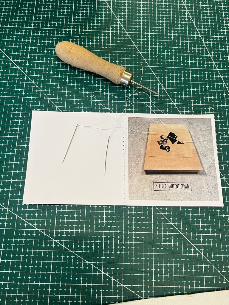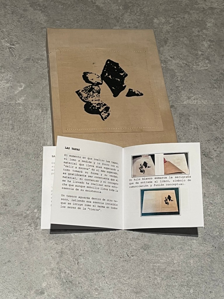 Y aquí viene el secreto que da vida a este proyecto: antes de coser, pregunté a Noelia la palabra que mejor resumía su trabajo. Me dijo «TIERRA». Imprimí esta palabra en un trocito de tela teñida y la escondí en el interior, actuando como el corazón pulsante de todo el trabajo. Un toque de alma en la Encuadernación de Manuscritos.