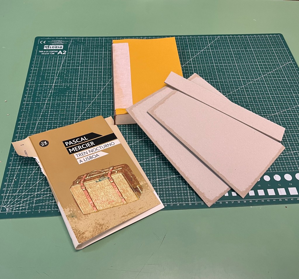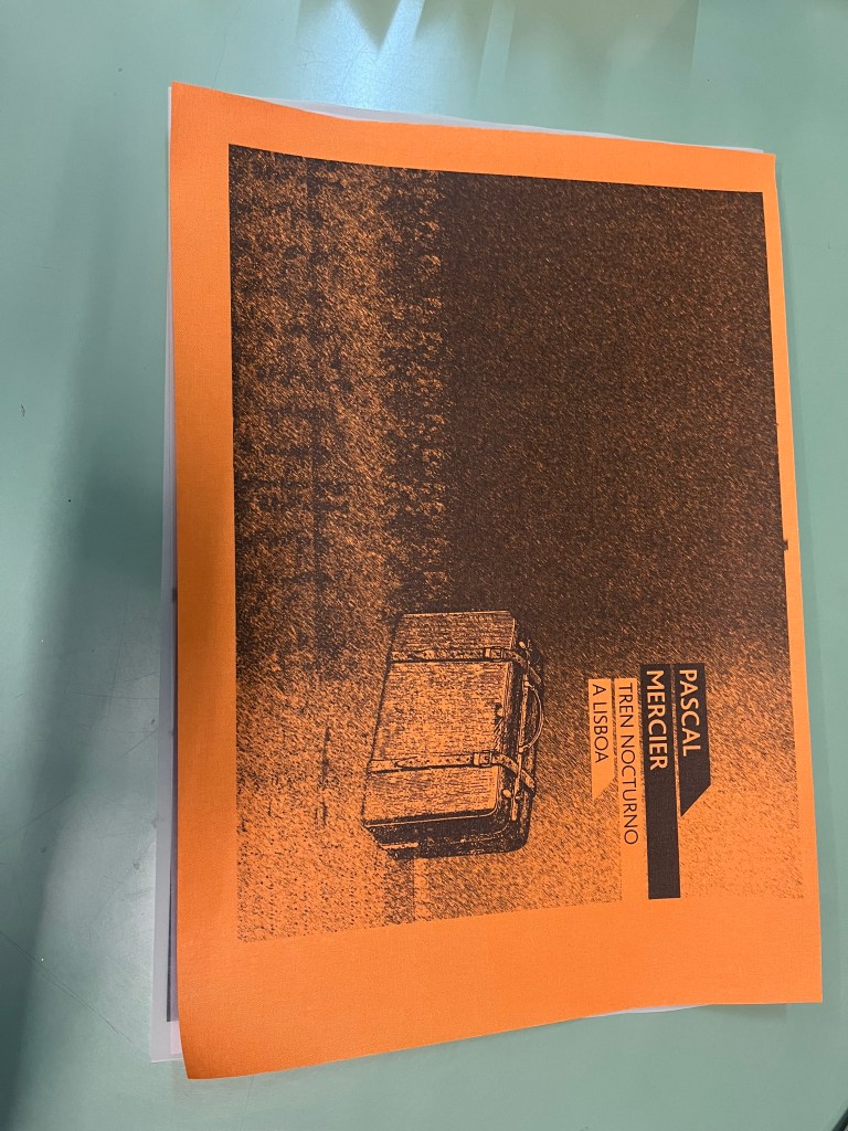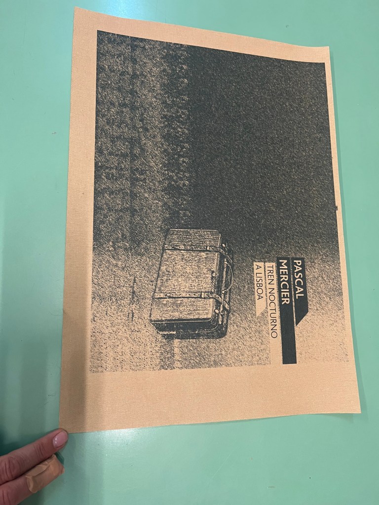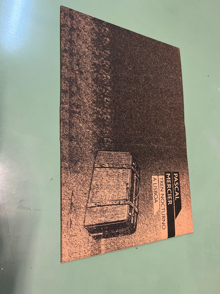 Recientemente, Yane nos visitó en el taller de enquadernaciobcn con un encargo muy especial: transformar su ejemplar de tapa blanda de la novela «Tren Nocturno a Lisboa» de Pascal Mercier. Su deseo era convertirlo en una pieza de tapa dura, más elegante y con un marcado toque vintage, ideal para un regalo inolvidable.
